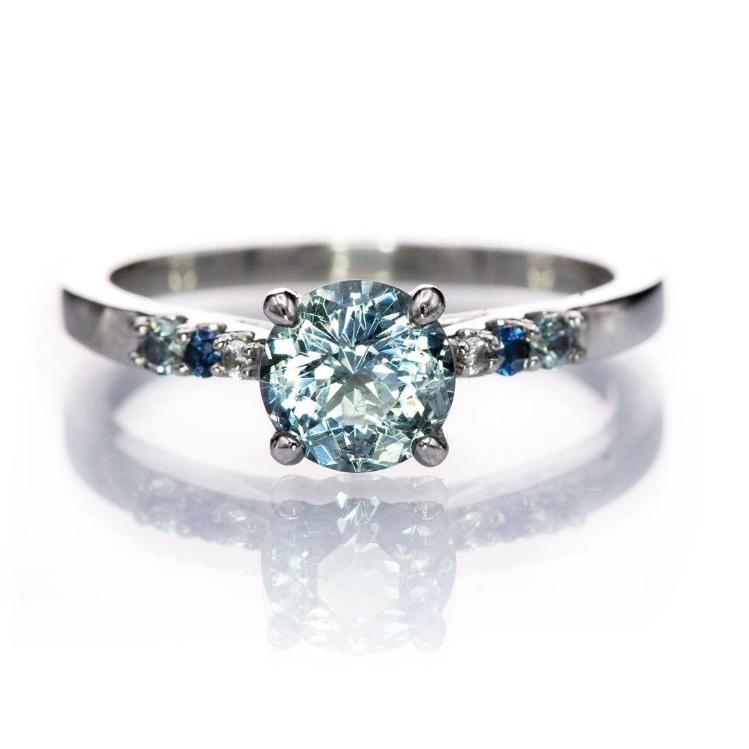 Go To IG Post     One fun custom project last year was this Natalie ring setting in platinum for Jane. The 1.05ct Montana sapphire in the center came from @gemfix . It has a beautiful pastel blue color in an amazing cut that just sparkles in every light. The side accents are a mix of white sapphires, deep blue Australian sapphires, and pastel Montana sapphires. Don’t you just adore the fresh cool colors of this ring?