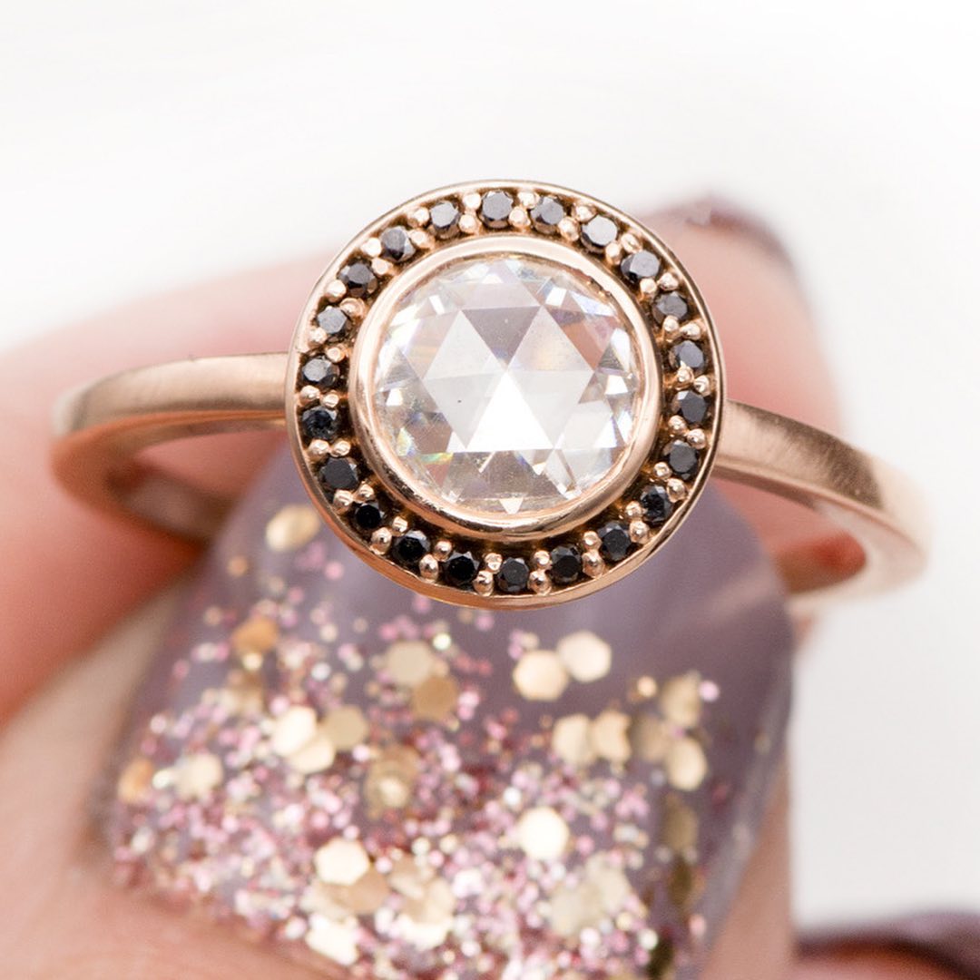 Go To IG Post     Rose cut Moissanite or diamonds, framed in a black diamond halo gives a more understated art decor look to an engagement ring. They are perfect if you like the durability of diamonds but not be do flashy. This low profile engagement ring shines in pure sophisticated elegance.