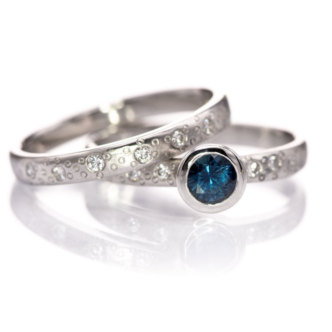 Here is a recently finished platinum bridal ring set with a gorgeous Royal Blue Fair Trade Australian Kings Plain sapphire engagement ring with an elevated bezel setting and matching diamond wedding band. The bezel setting has a peekaboo cut out on the sides to show off the amazing sparkle and color of this gemstone. The ring shank was crusted with a stardust like texture of flush set white diamonds.