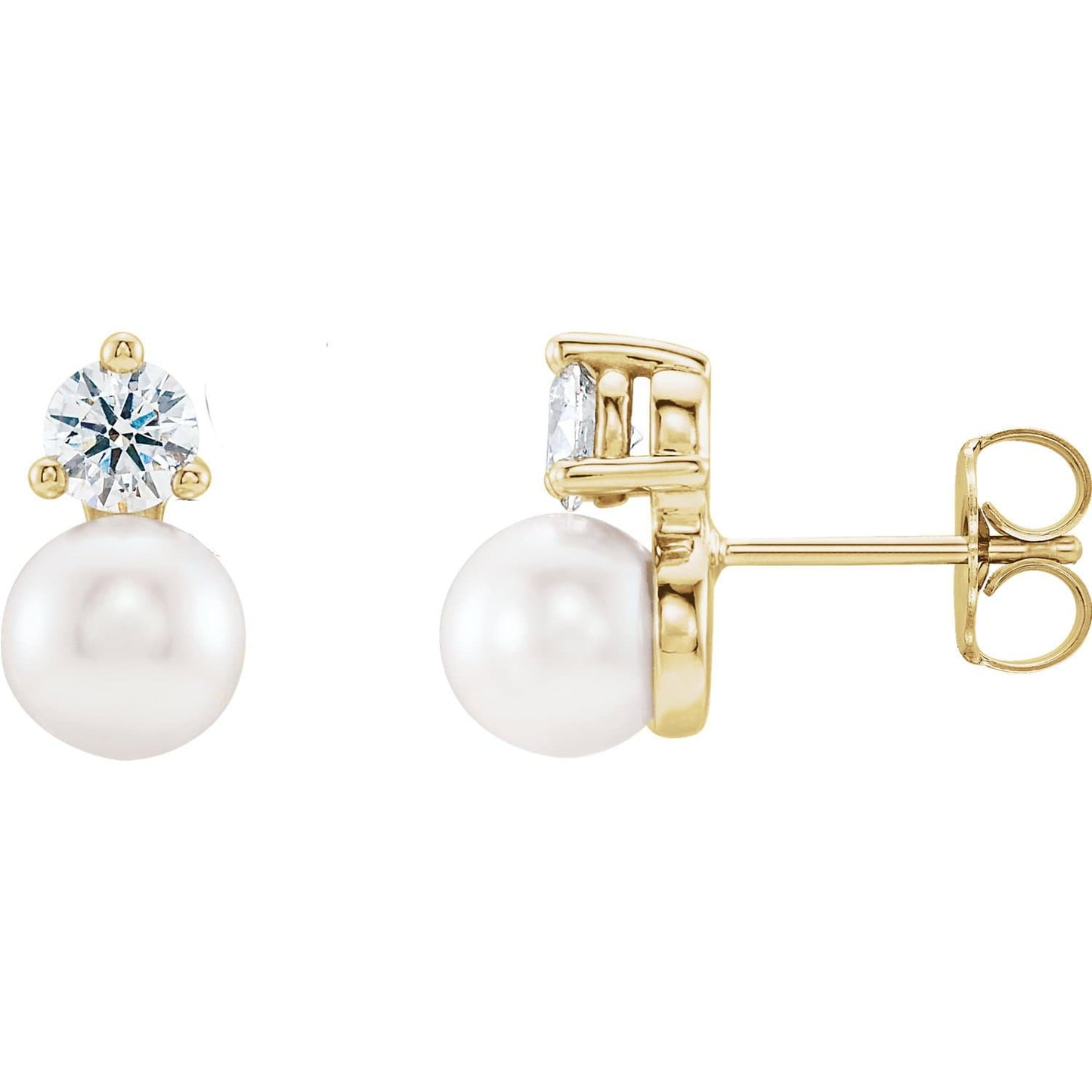 Sparkly white Freshwater Cultured Pearl stud earrings with prong set conflict free round diamonds for everyday wear or a night out. It comes in 3 sizes and various metal options.