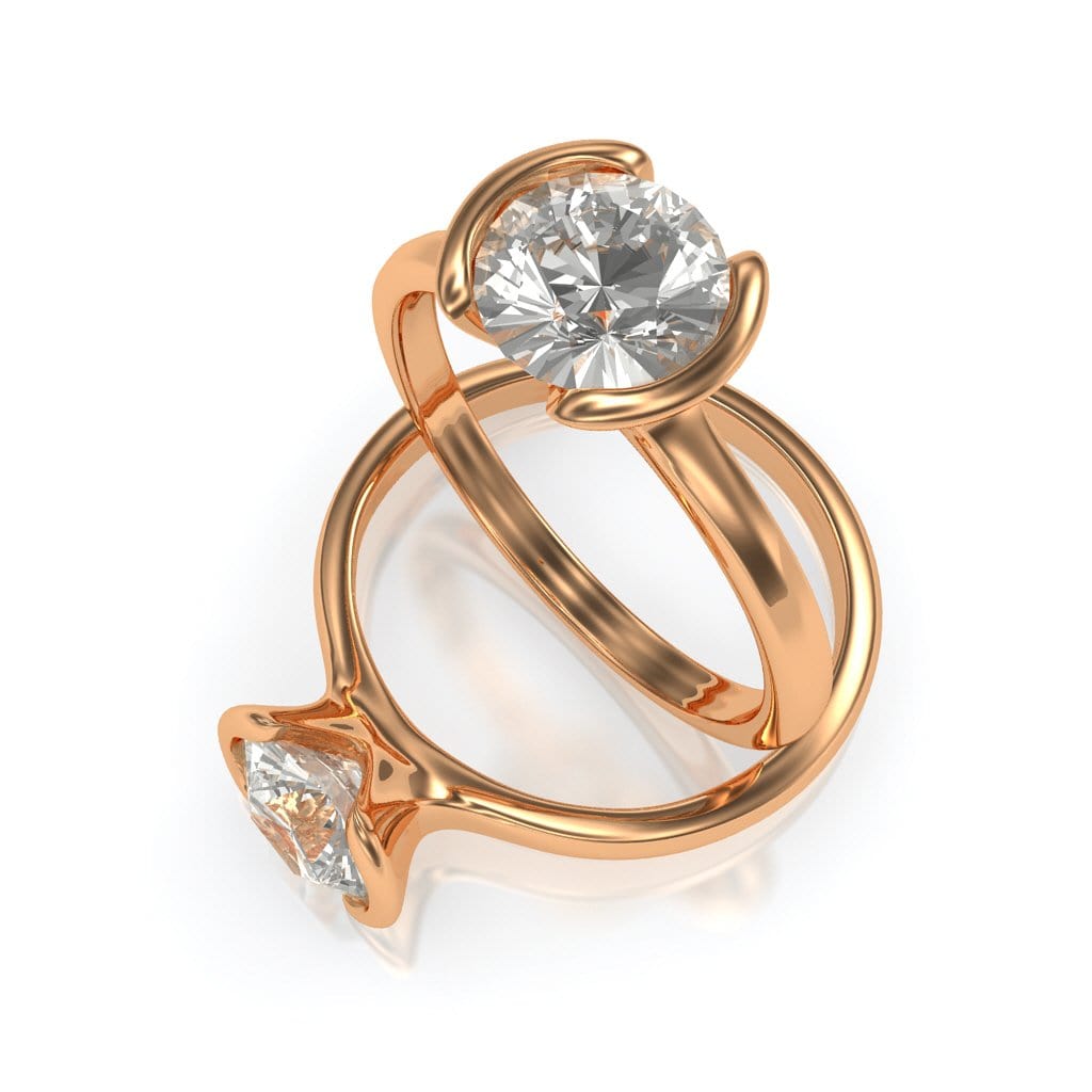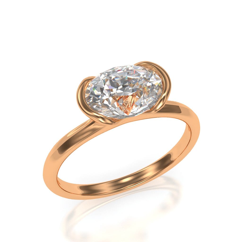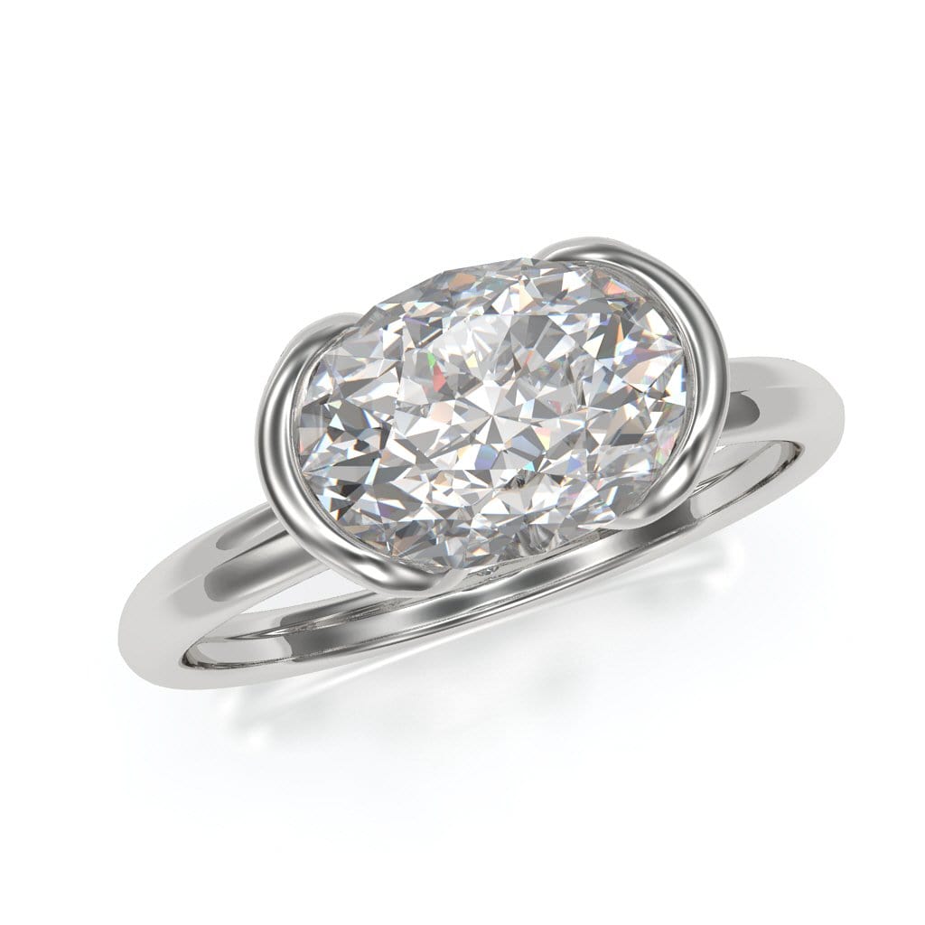 This semi-bezel setting provides both protection for the gemstone and allows for additional light to enter. The low profile design features a v-shape opening on the north-south axis. Oval and emerald-shaped gems or diamonds are elegantly oriented in the East-West direction.