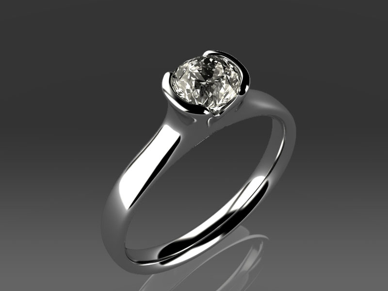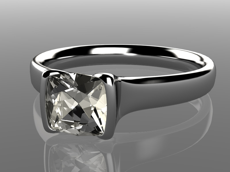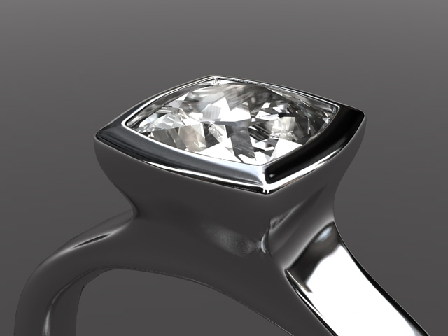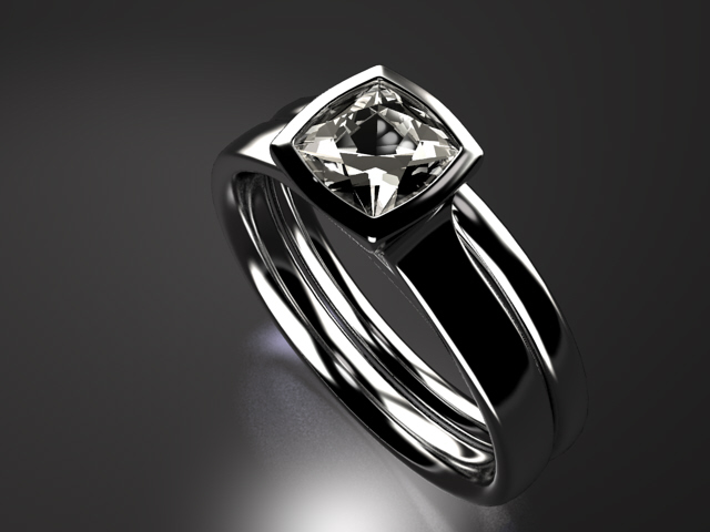 I am already working on some custom orders for these new designs, all are modified from the original by using larger stones and applying different finishes on the metal. When an order comes in I mostly still carve the rings by hand in wax. I actually photographed some stages of carving a model in wax and will post them to the blog in the next days. This will show how to bring those digital designs to life and on the hands of a lucky bride. The current design I am hand modelling is this setting with a 5.5 mm cushion Moissanite, made in Silver/Palladium alloy with matching wedding band. Both rings will get a hammered texture.