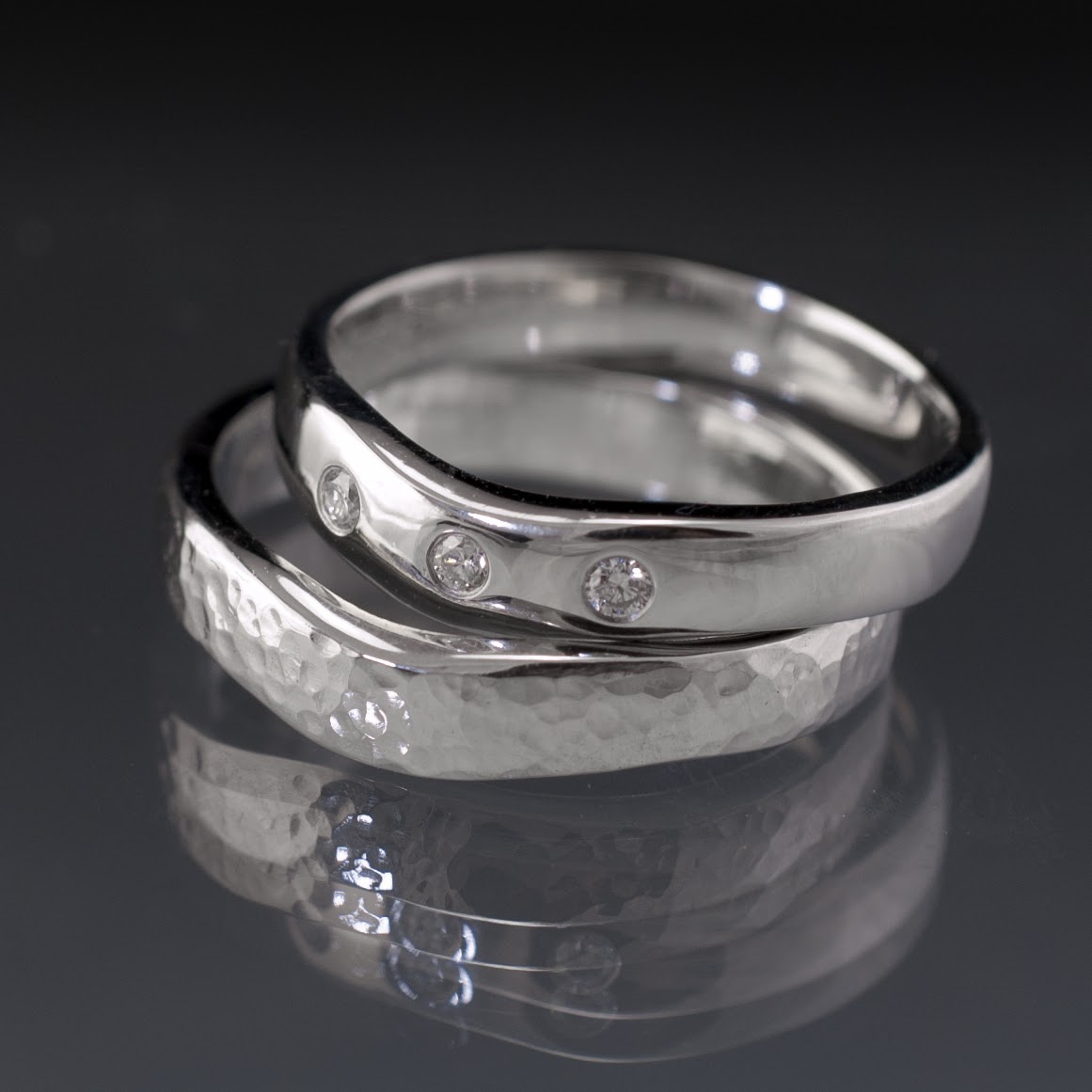 | Palladium wedding bands with hammered texture and recycled diamonds |