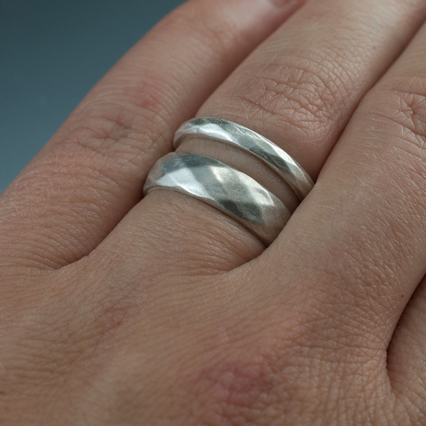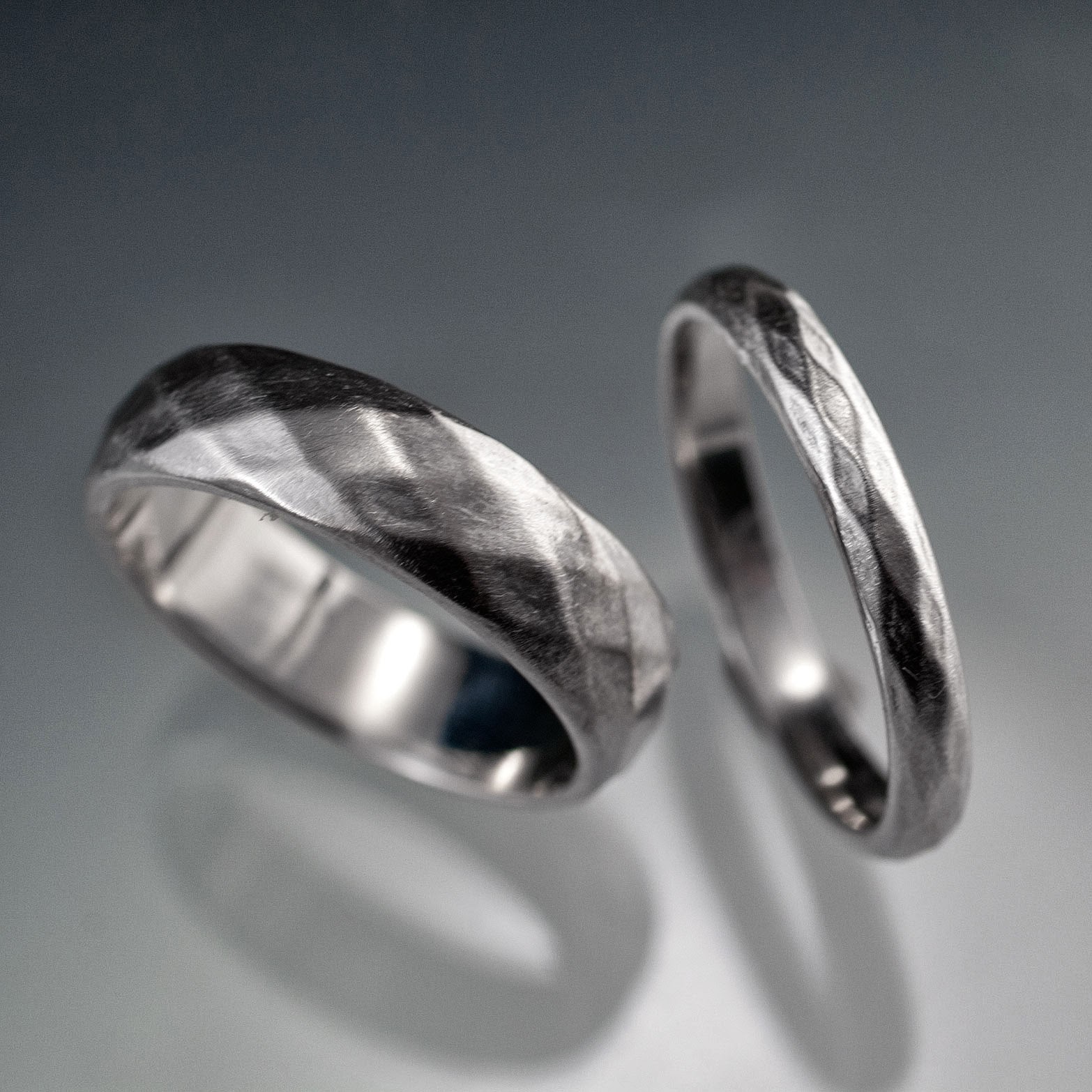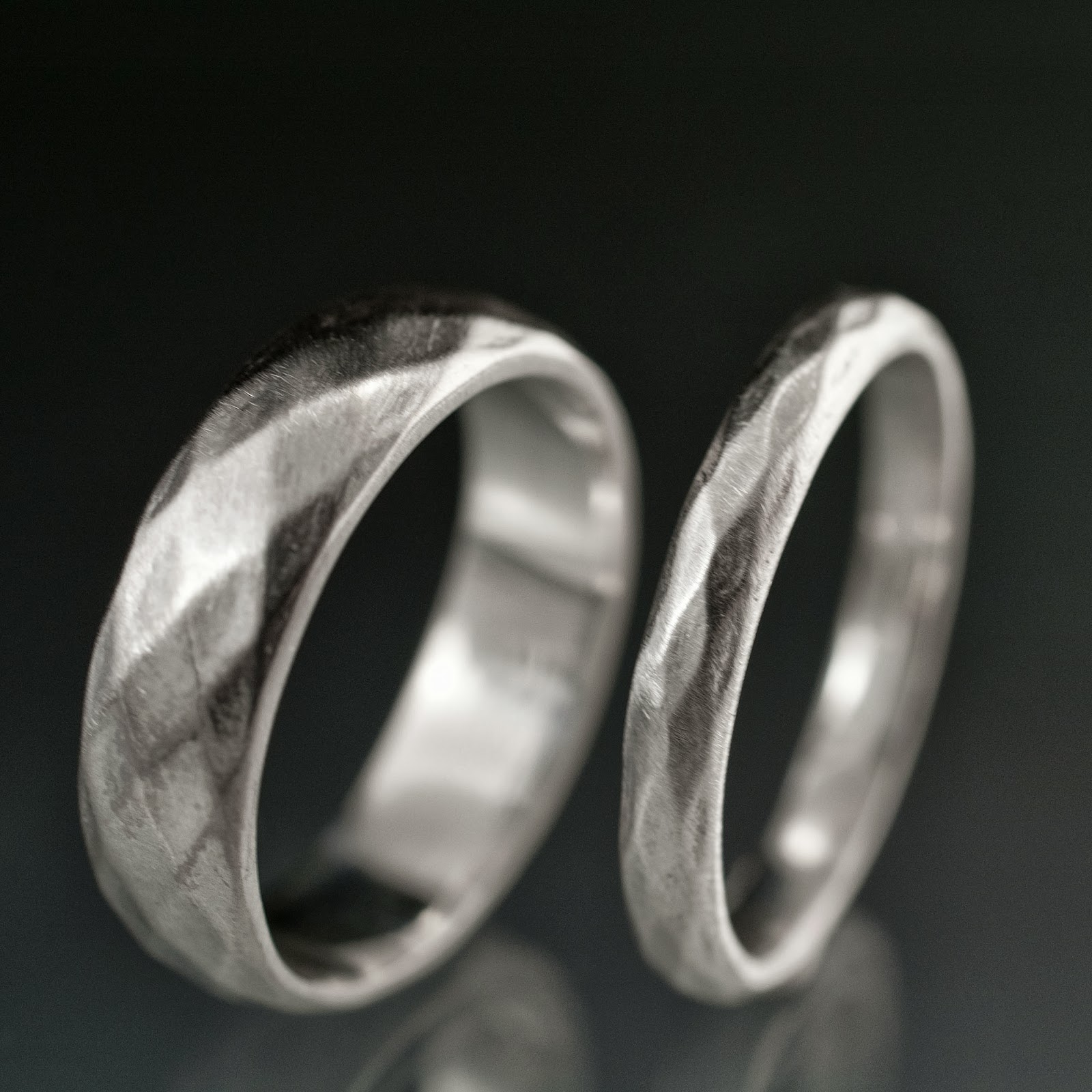 I went ahead and CNC milled 2 rings in wax in different width with a diamond shape facet pattern to see how well that pattern would translate into the real world with the tools I have on hand. Cast those in Sterling Silver. The facet edges came out a bit softer after polishing the wax first to remove the light tool path lines and then a light polish and satin brushed finish over the silver rings. I prefer it that way as it looks less machined. A more subtle look. Overall this makes some simple, lightly textured wedding rings with a soft feel. Here the finished rings: