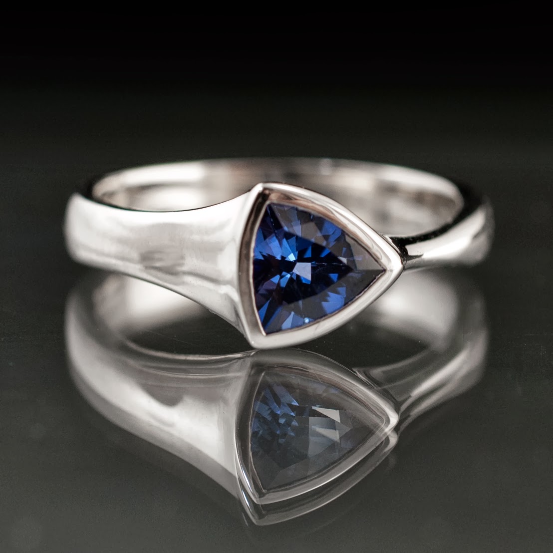 A couple weeks ago I finished a set of 4 rings for an awesome couple. They wanted matching bridal sets each from my Tetra collection which incorporate trillion cut faceted stones. For their sets they chose a lab created blue sapphire and a Mozambique garnet set in palladium with a matching 2mm contoured wedding band.
