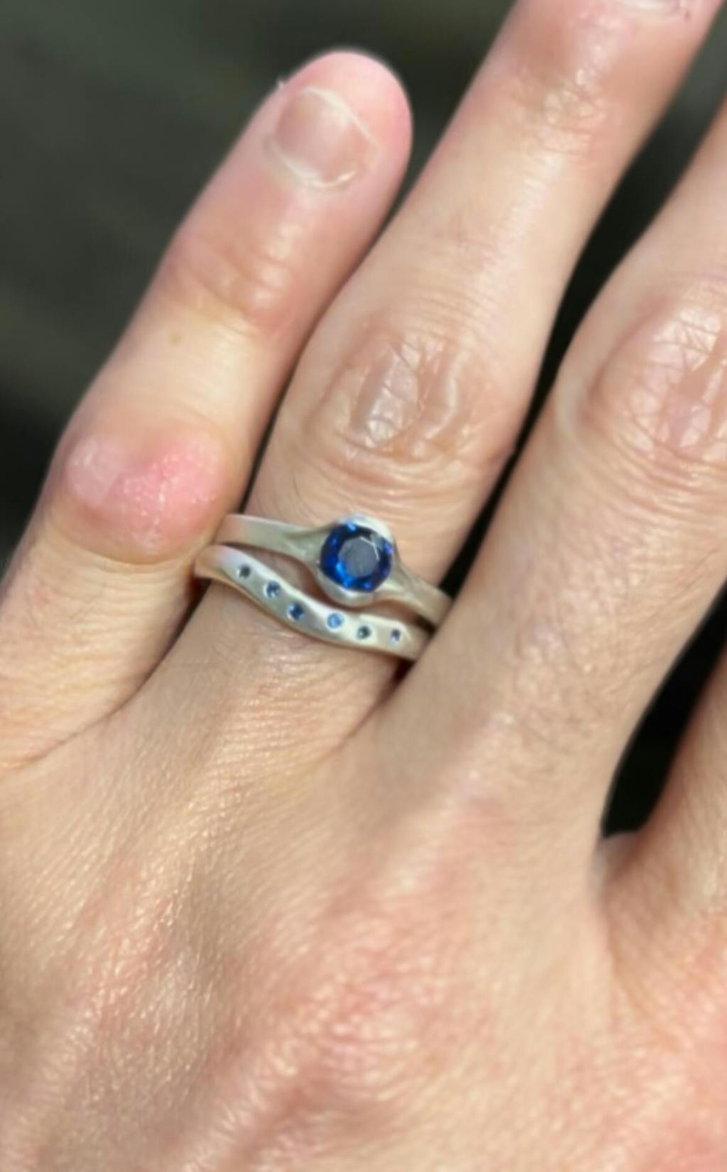 I’ve been wanting a unique blue sapphire wedding set for a while. I’m rough on my hands, and I prefer low profile rings. This set just called to me! Fits perfect, it’s comfortable, unique, beautiful and well made! This has now become my daily wedding set and I love it! Can’t wait for my next piece from Konstance! Thanks again!