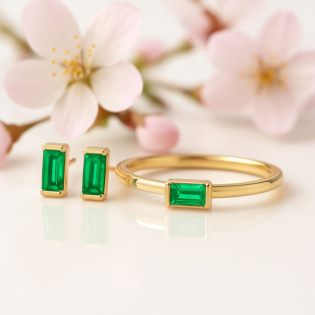 14k gold stud or platinum earrings for everyday wear with channel set beautiful baguette shape lush green emeralds