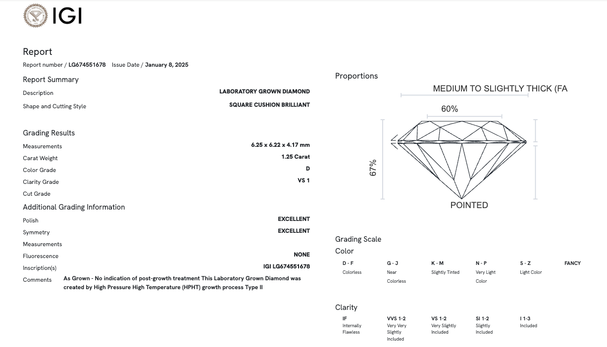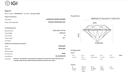 The ring is a bezel set Emma engagement ring in platinum with a  lab grown cushion Cut 1.25ct diamond.