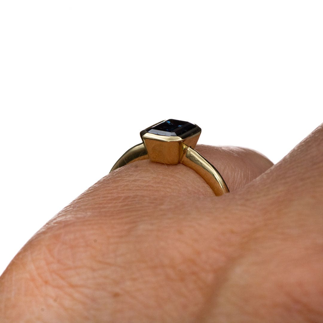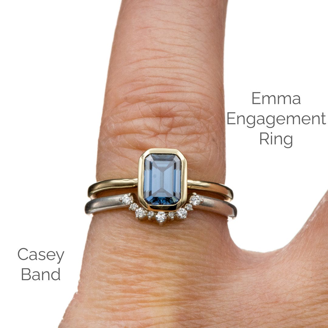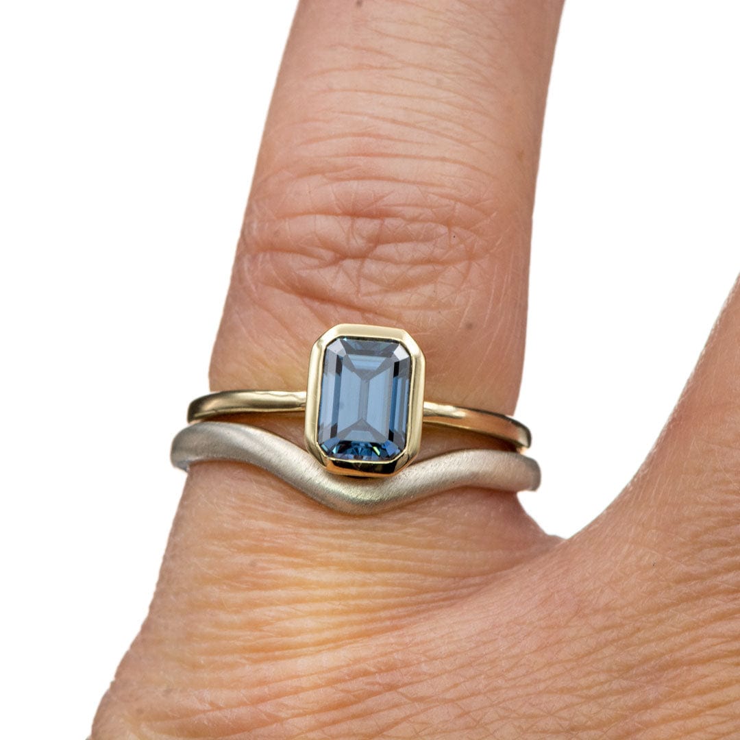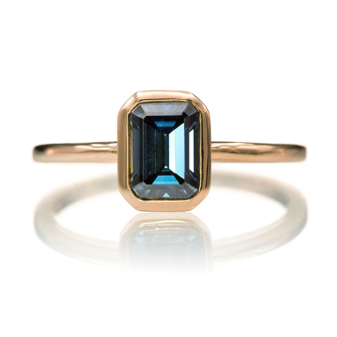 Low Profile Emma Ring - Bezel Set Blue-Gray Emerald Cut Moissanite Solitaire Engagement Ring. Simplicity is the ultimate sophistication, and this minimalist engagement ring doesn't need to shout from the roof tops.