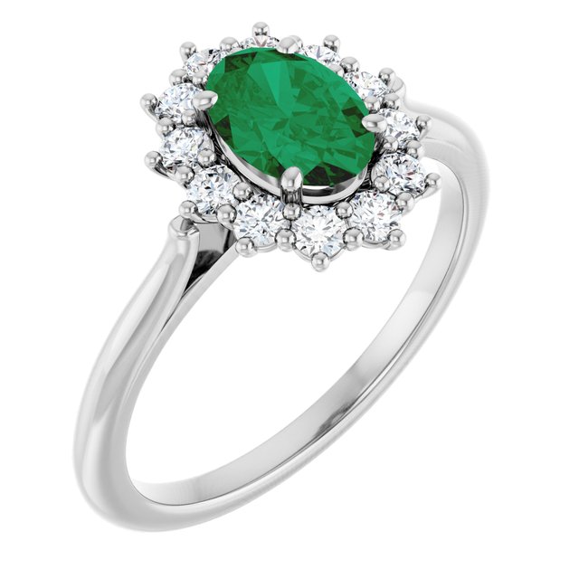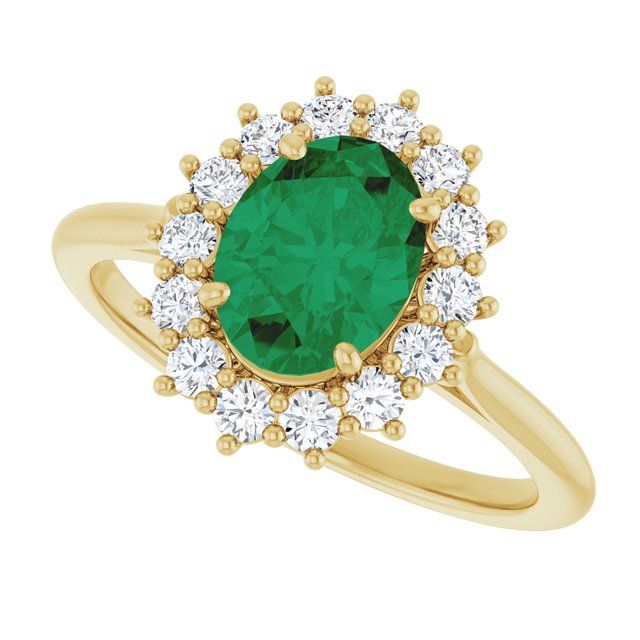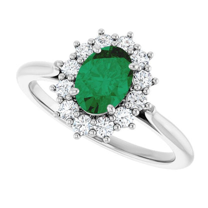 Experience true elegance with the Ophelia ring, featuring a prong-set, lab-grown oval Emerald ethically sourced and surrounded by a dazzling diamond halo.