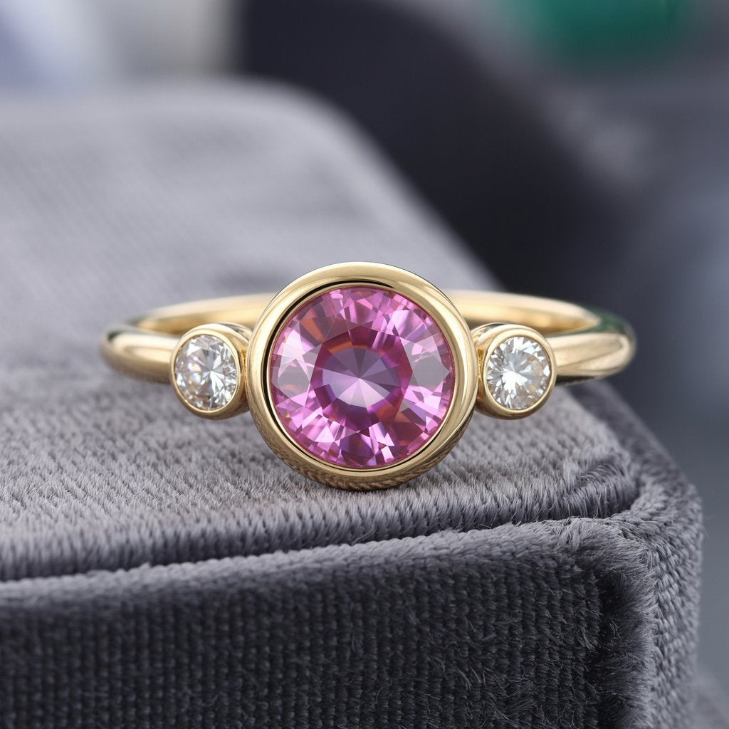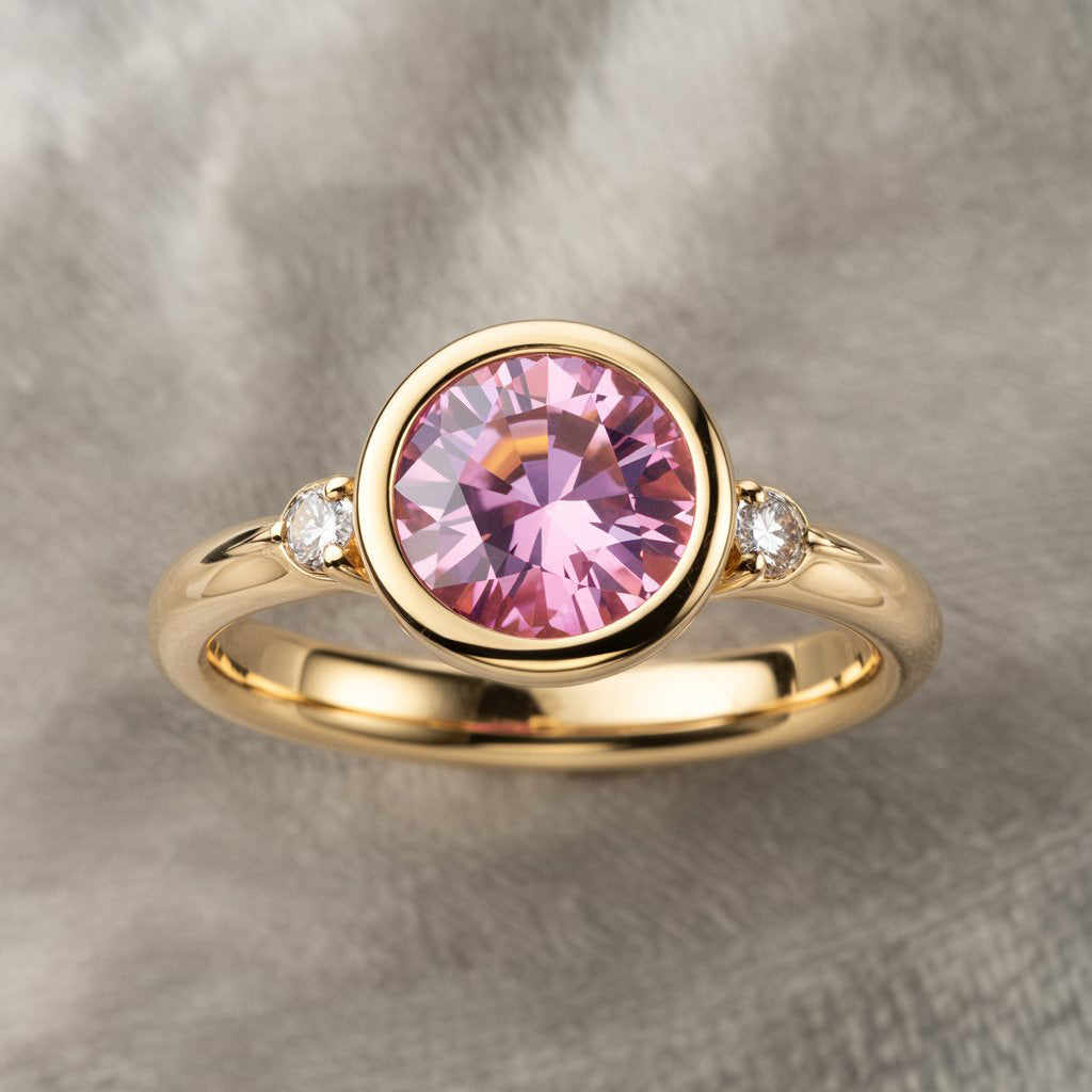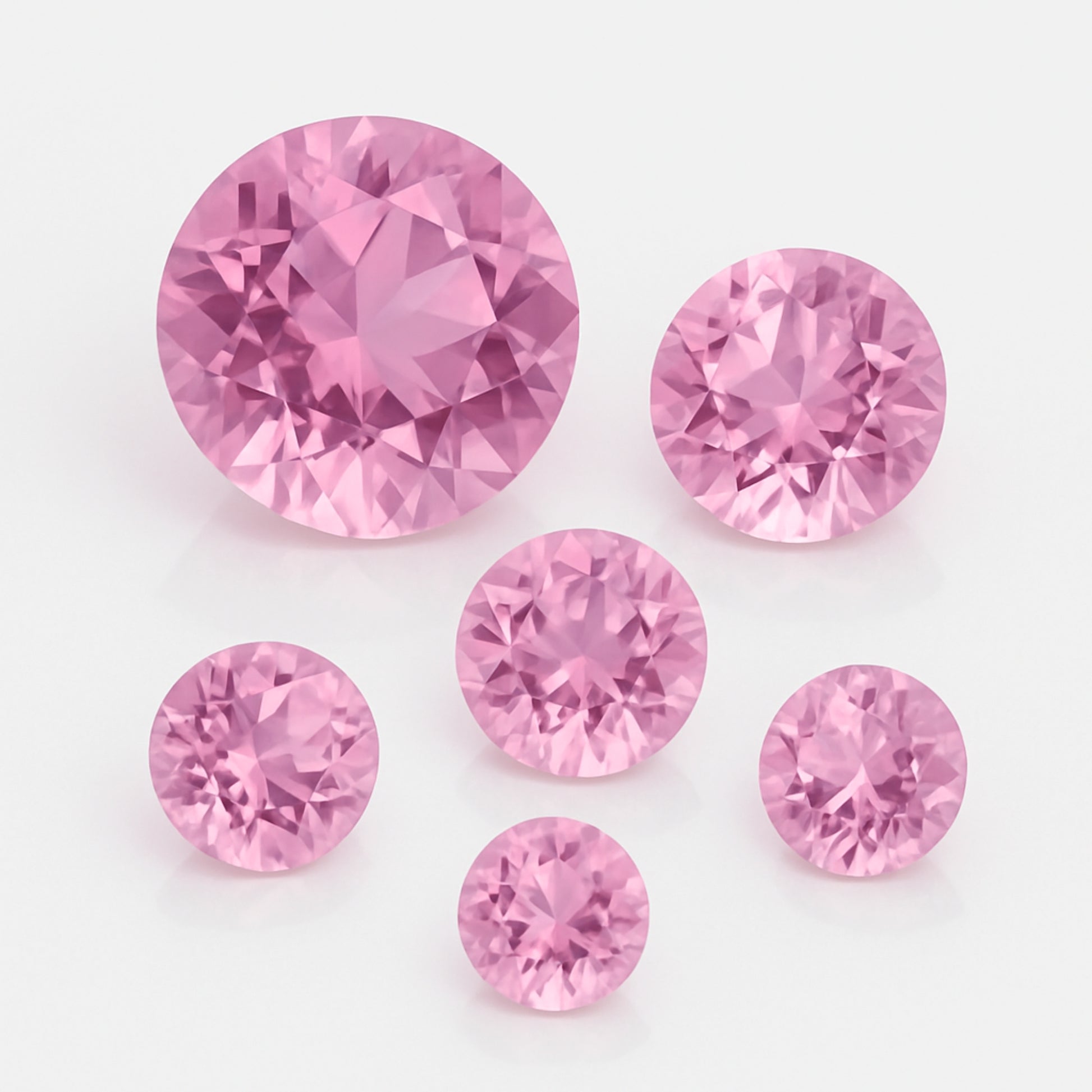 These loose round faceted cut lab-created pink sapphire gemstones are available for a custom-built ring by Nodeform Jewelry.