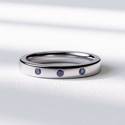Simple 2.5mm wide wedding band with 3 flush set lab grown Alexandrites on a narrow flat wedding ring. A perfect band to stack next to many engagement ring designs.