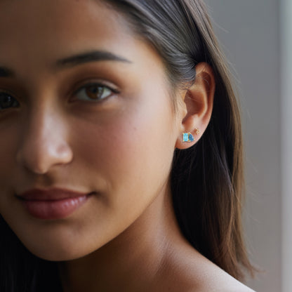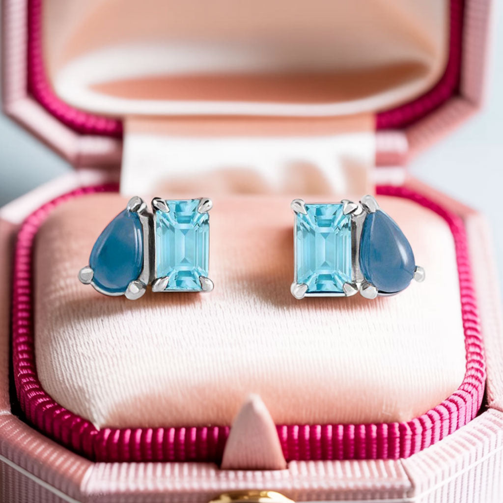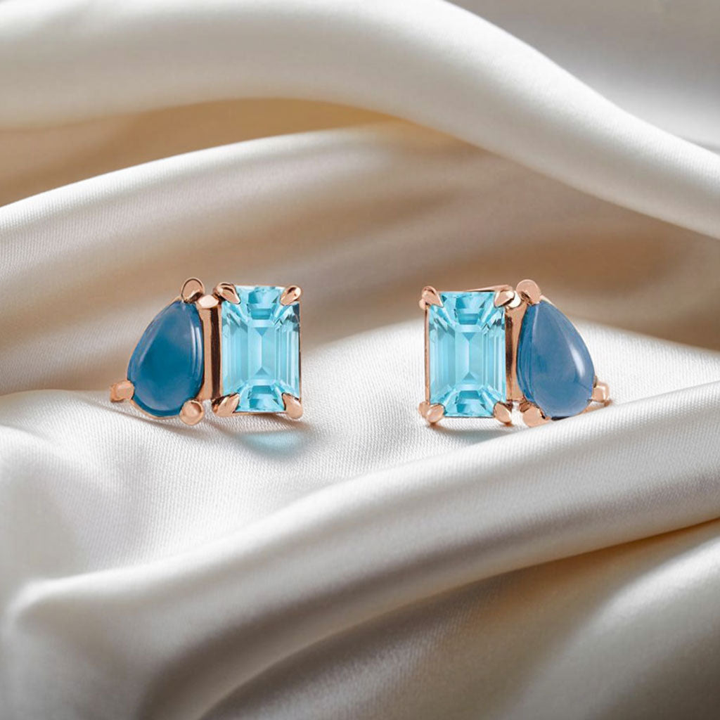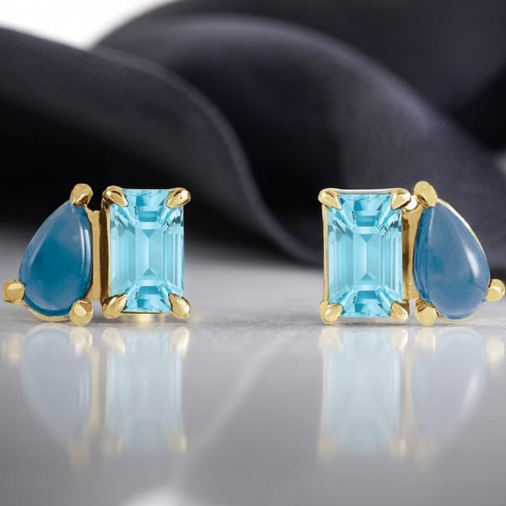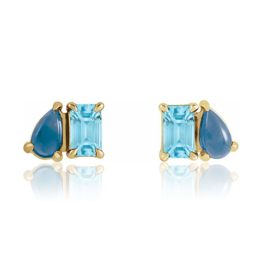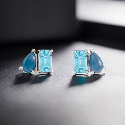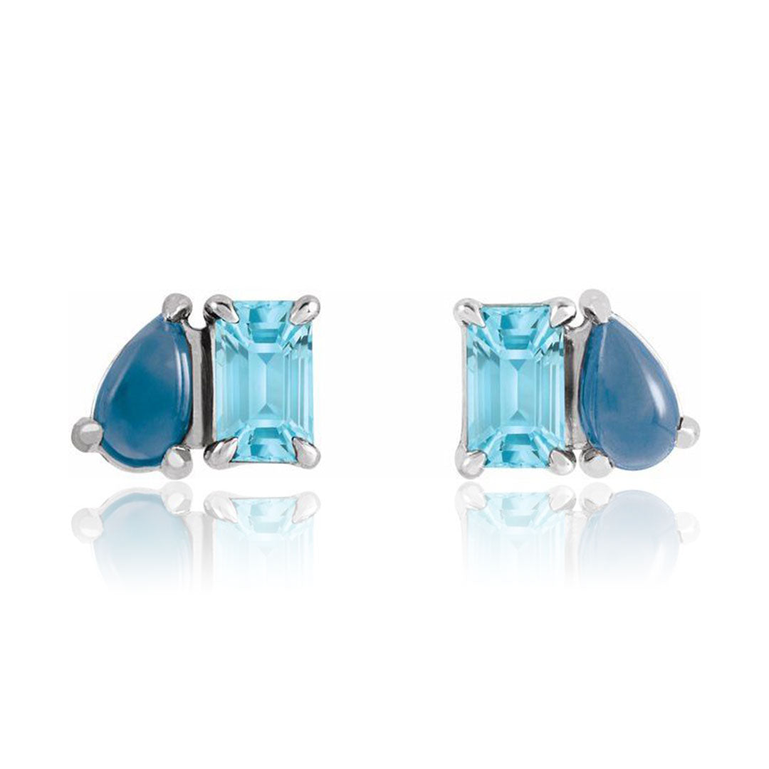 Two-stone stud earrings for everyday wear with beautiful pear shape London Blue Topaz cab and a emerald shape sky blue topaz. This design combines two of the stunning icy blue December birthstones in a playful way.