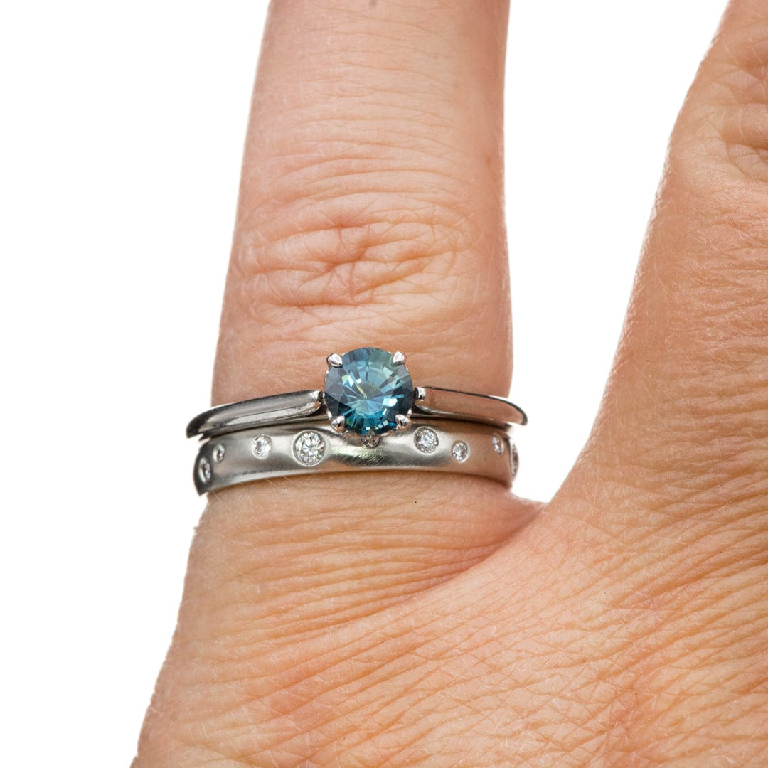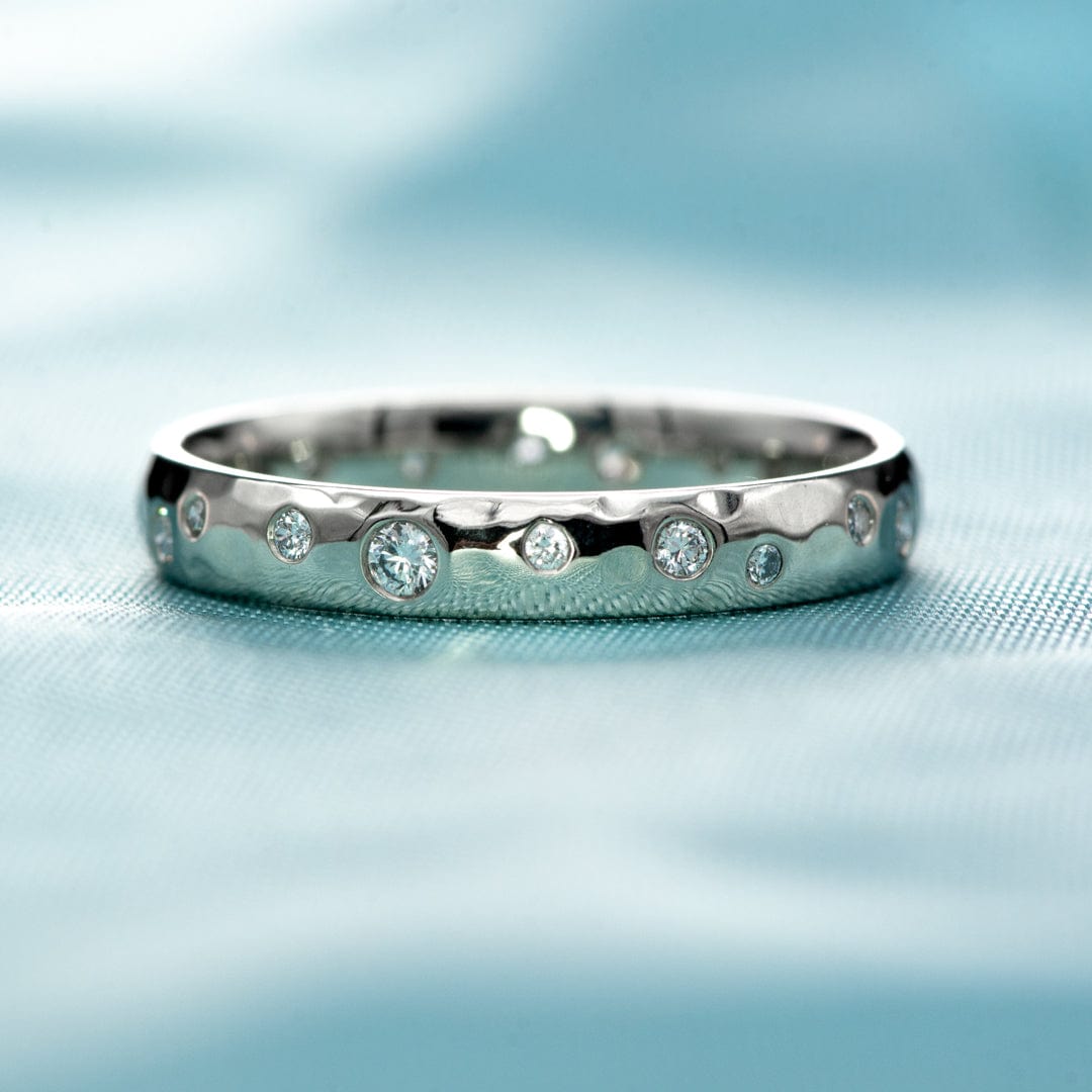 4mm wide comfort-fit scattered diamond eternity wedding ring. Narrow simple slightly domed wedding band with sparkly white diamonds of various sizes placed randomly around the entire ring.