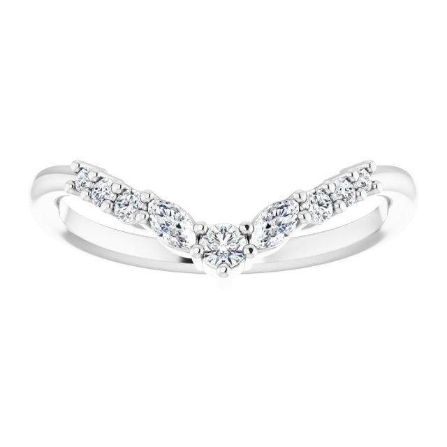 The Vanessa band, a stacking V-shaped curved wedding ring with prong-set round and marquise shape white diamonds in your chosen precious metal. This deep chevron-shaped band leaves lots of space for low profile engagement ring settings.