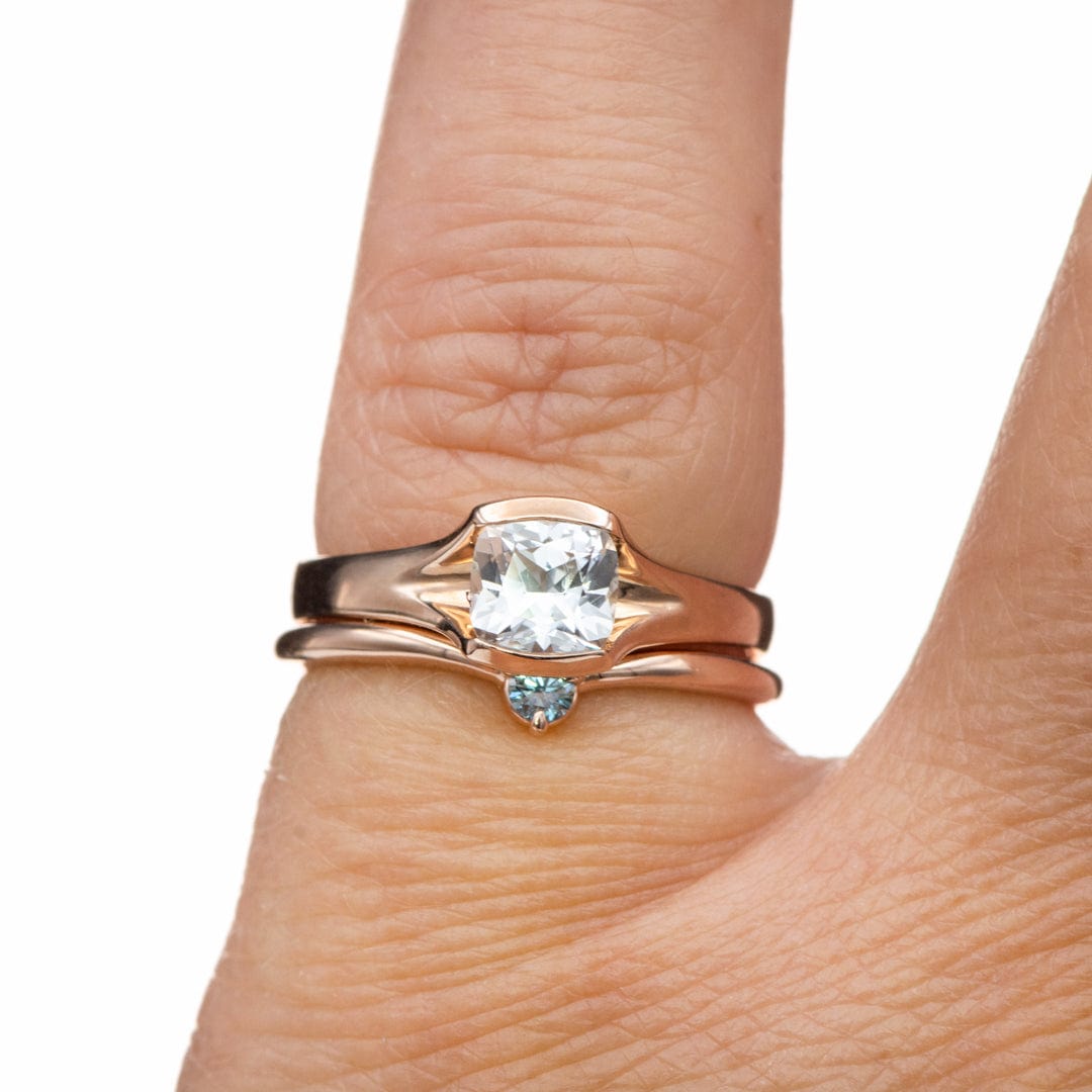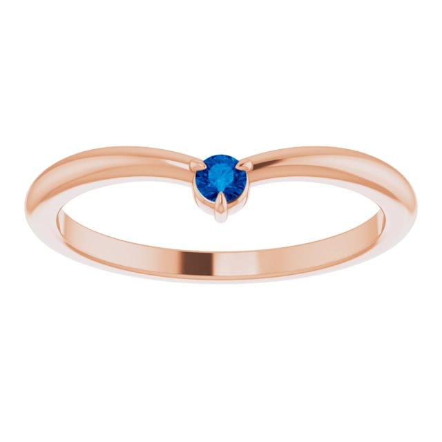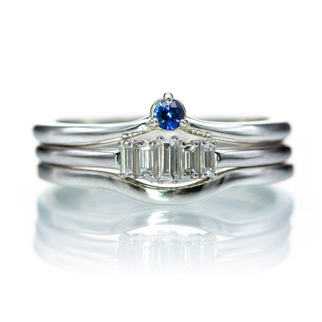 The Velma band. A stacking V-shaped chevron wedding ring with a choice of prong set diamond, moissanite, blue sapphire, or white sapphire in your chosen precious metal.