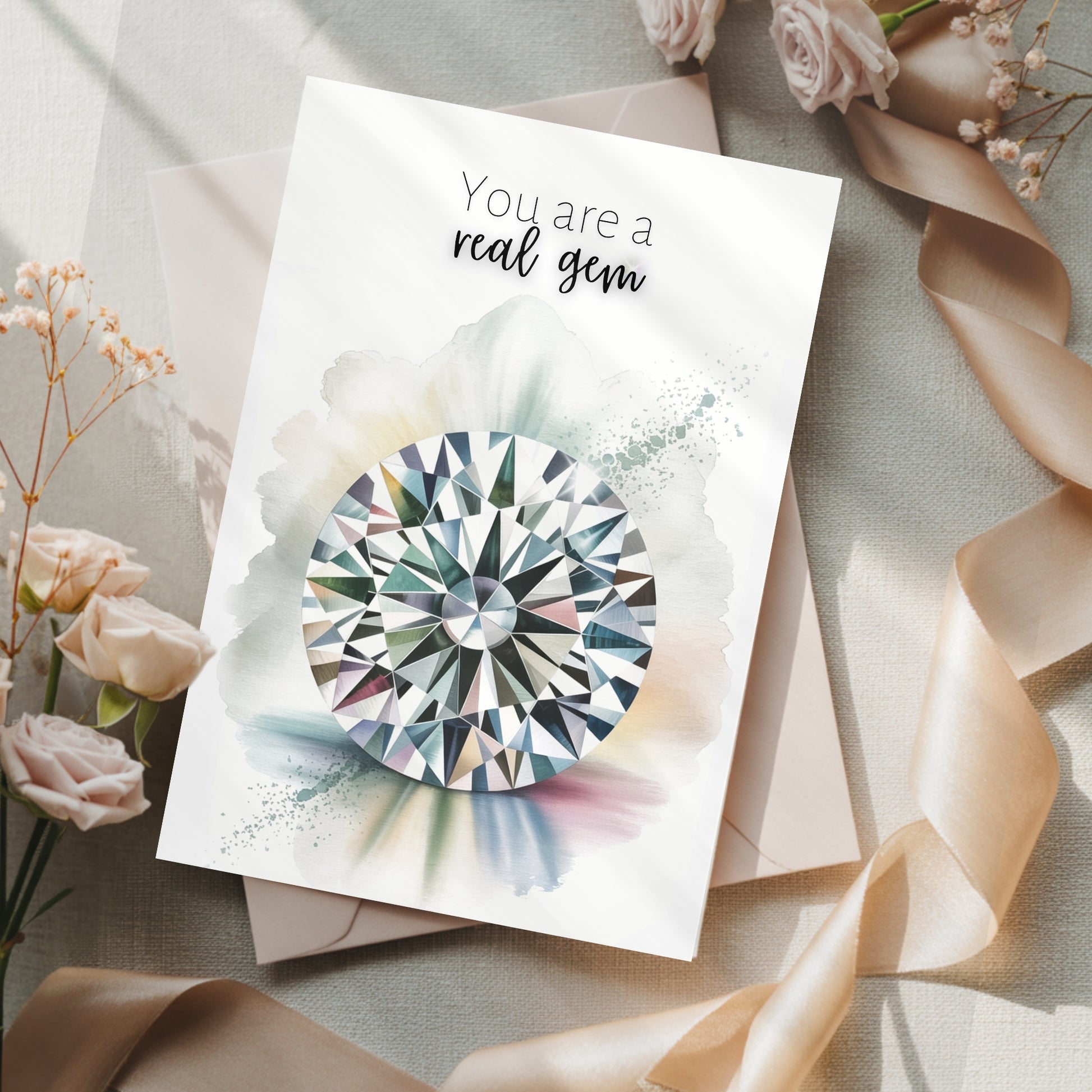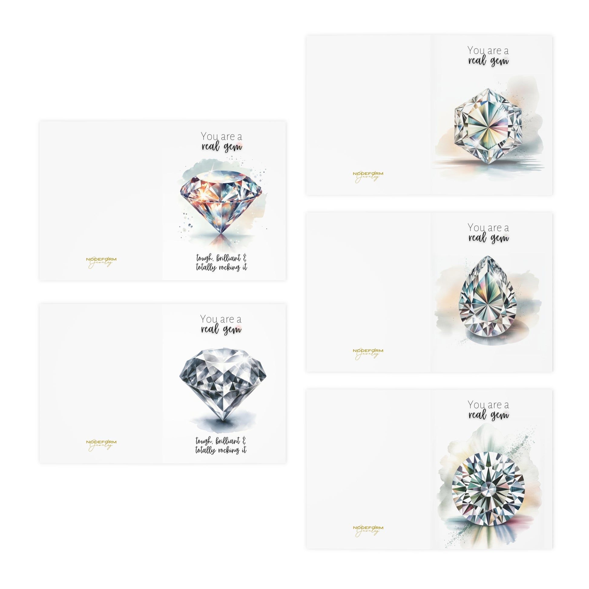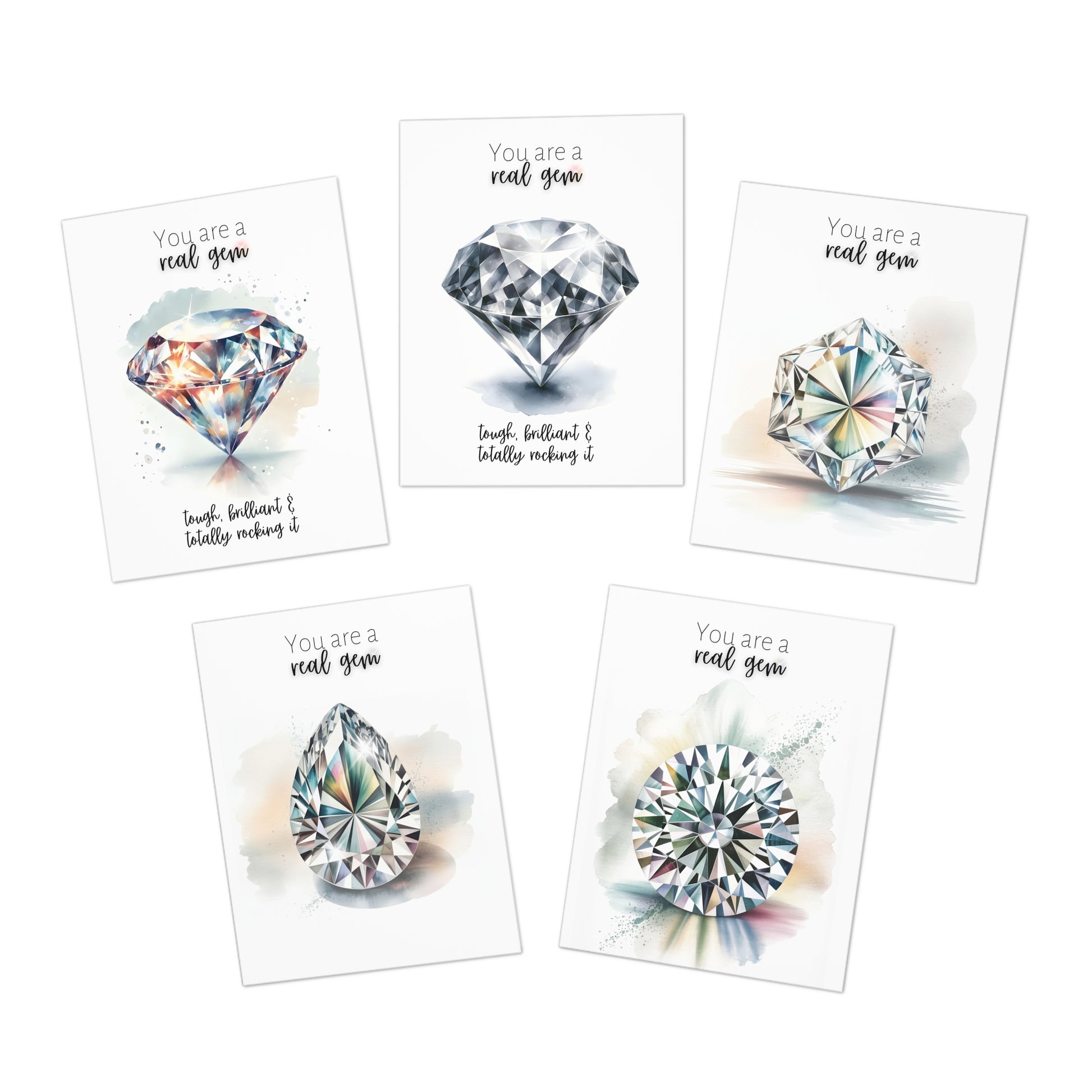 Five exquisite greeting cards showcase watercolor renderings of beloved diamond cuts, each infused with luminous detail and delicate color gradations. Minimalist sentiments grace the front of each card, inviting your personal message within. Crafted on substantial, uncoated paper stock, the designs possess an understated elegance reminiscent of fine art. Paired with crisp white envelopes, this collection transforms ordinary correspondence into a thoughtful gesture—ideal for layering into gifts, accompanying floral arrangements, or displaying as everyday reminders of life's refined moments.