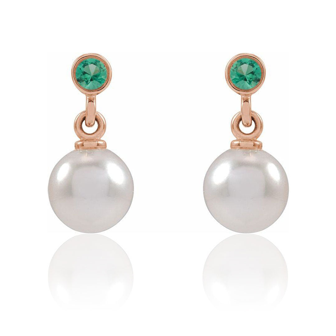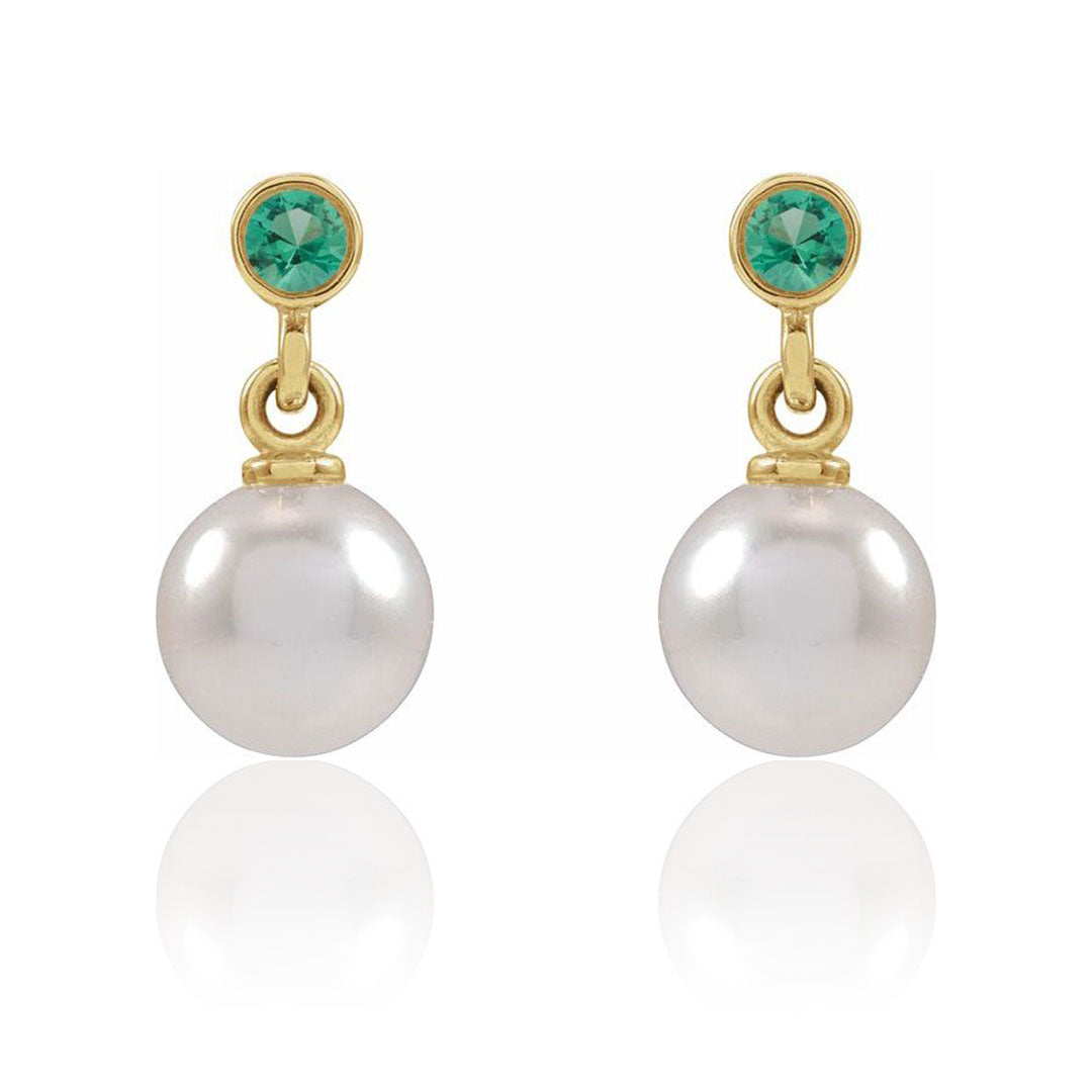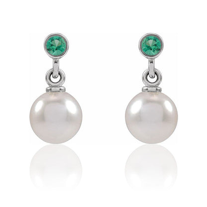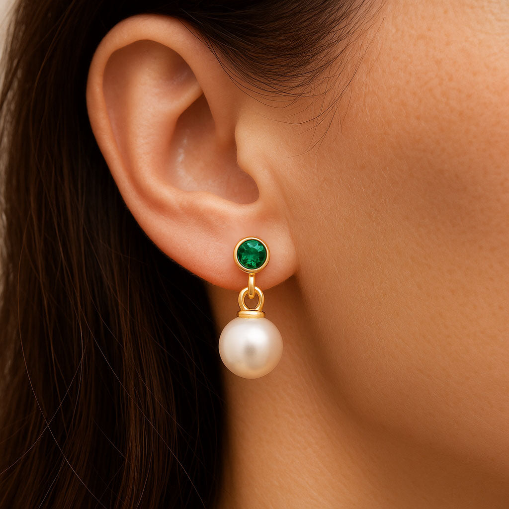 Elegant and timeless, these exquisite dangle earrings feature radiant round-cut lab-grown emeralds set in Platinum or gold bezels. Suspended gracefully beneath each emerald is a luminous white Akoya pearl, known for its exceptional luster and smooth, round surface. The delicate gold loops and secure settings add a refined touch, while the vibrant green of the emeralds contrasts beautifully with the soft glow of the pearls. Perfect for both special occasions and everyday sophistication, these earrings effortlessly combine classic charm with modern craftsmanship.