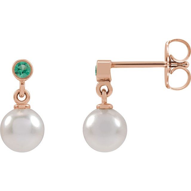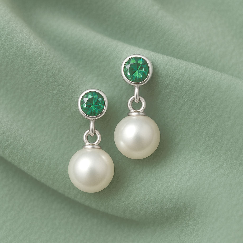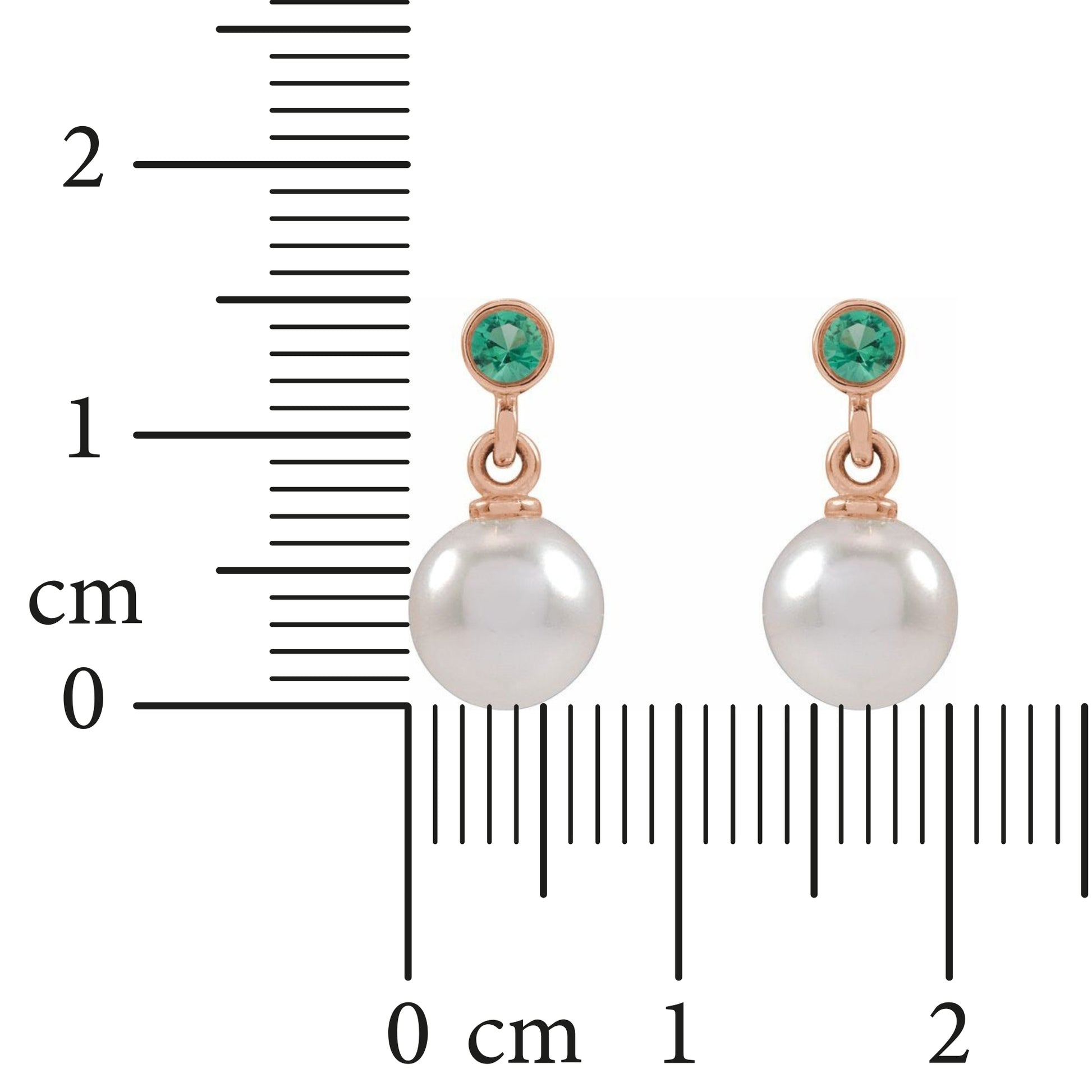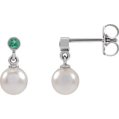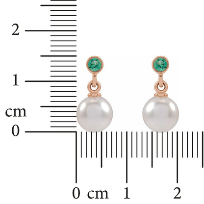 Elegant and timeless, these exquisite dangle earrings feature radiant round-cut lab-grown emeralds set in Platinum or gold bezels. Suspended gracefully beneath each emerald is a luminous white Akoya pearl, known for its exceptional luster and smooth, round surface. The delicate gold loops and secure settings add a refined touch, while the vibrant green of the emeralds contrasts beautifully with the soft glow of the pearls. Perfect for both special occasions and everyday sophistication, these earrings effortlessly combine classic charm with modern craftsmanship.