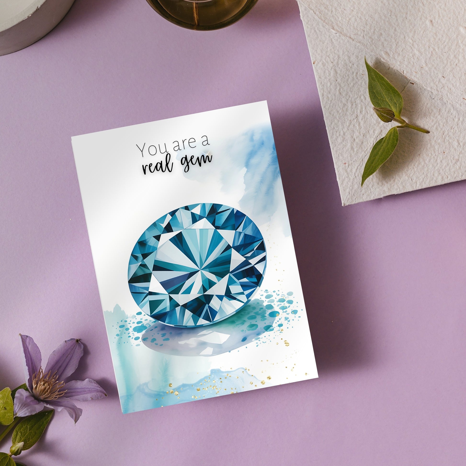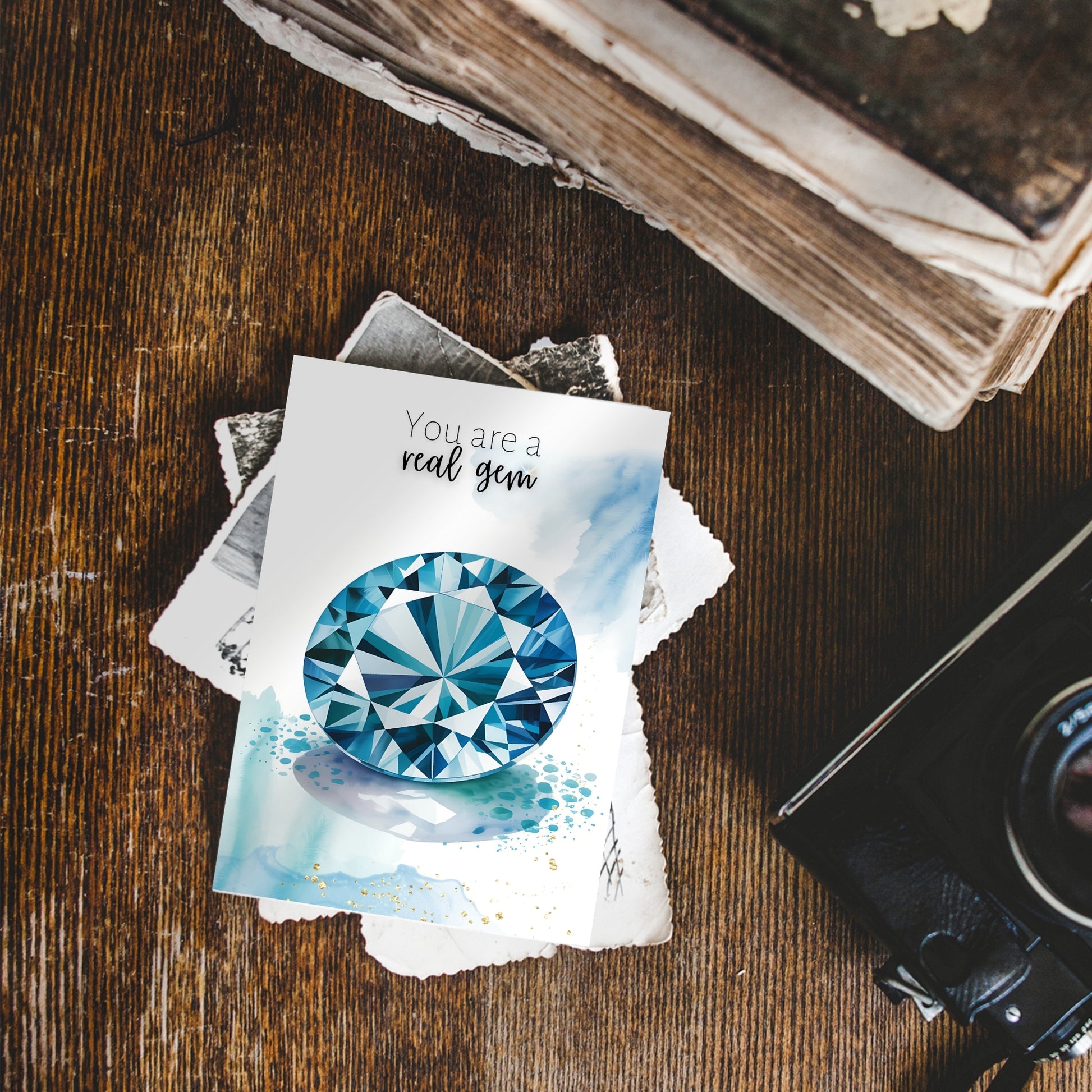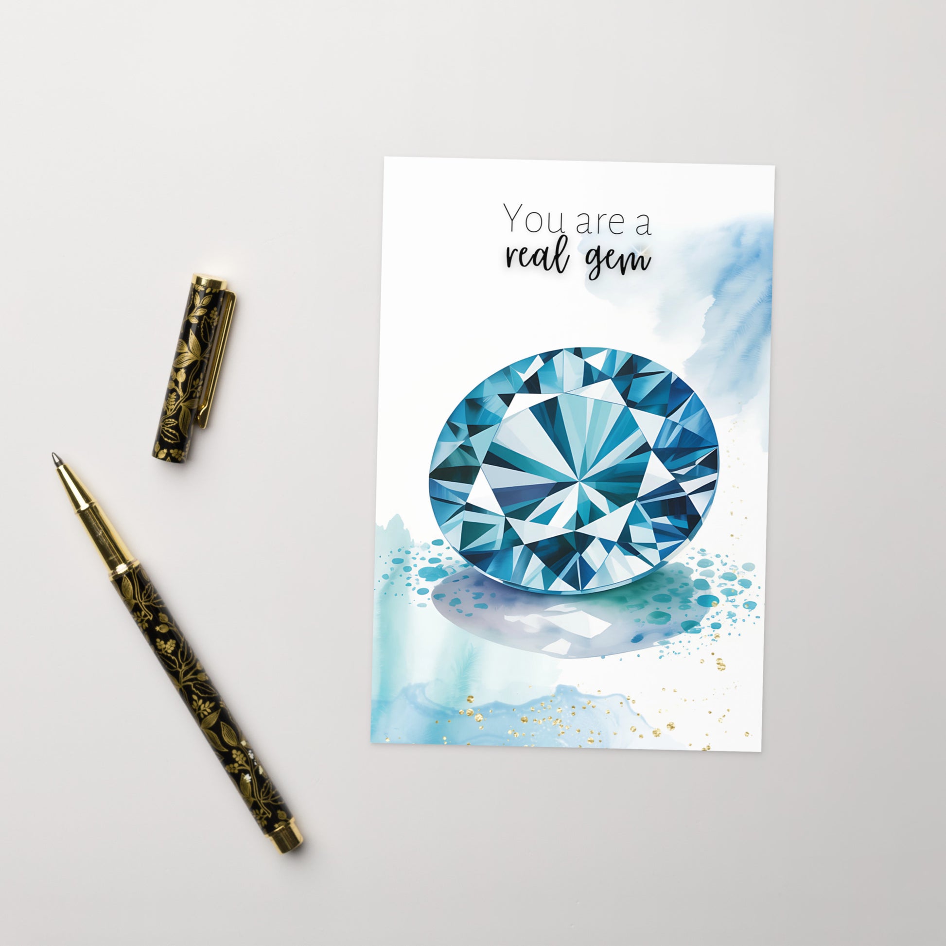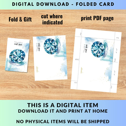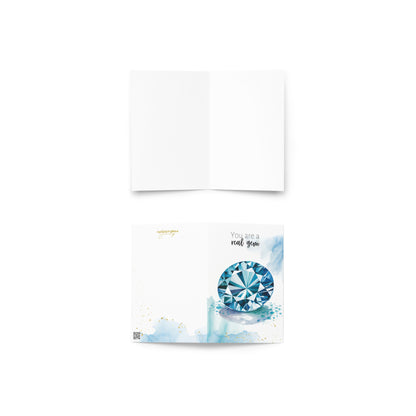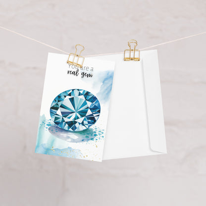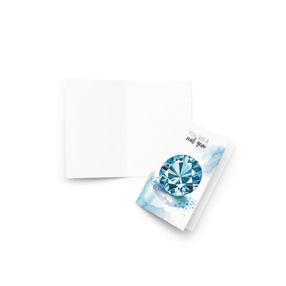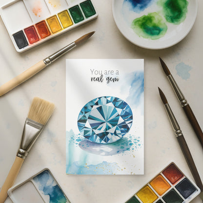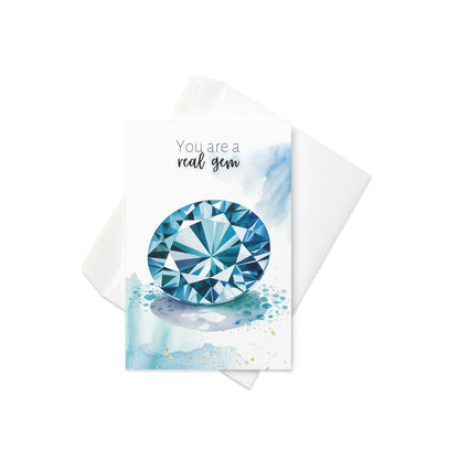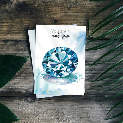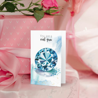 Celebrate special occasions or show appreciation to a cherished gem with this  "You are a real gem" watercolor London Blue Topaz card! Perfect for birthdays, Valentine's Day, Mother's Day, or just to say thanks to a precious gem in your life. Featuring exquisite topaz gemstone illustration and a heartfelt message, this folded card is guaranteed to make them feel truly exceptional.