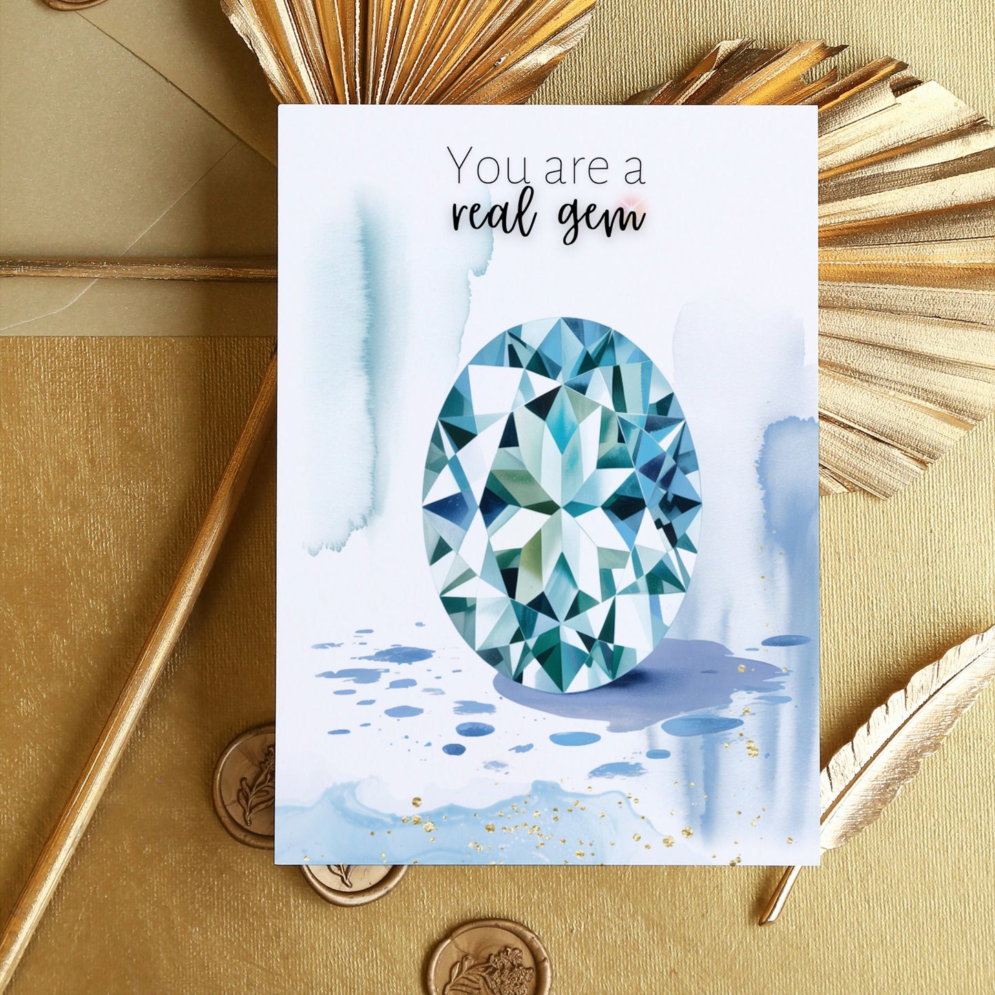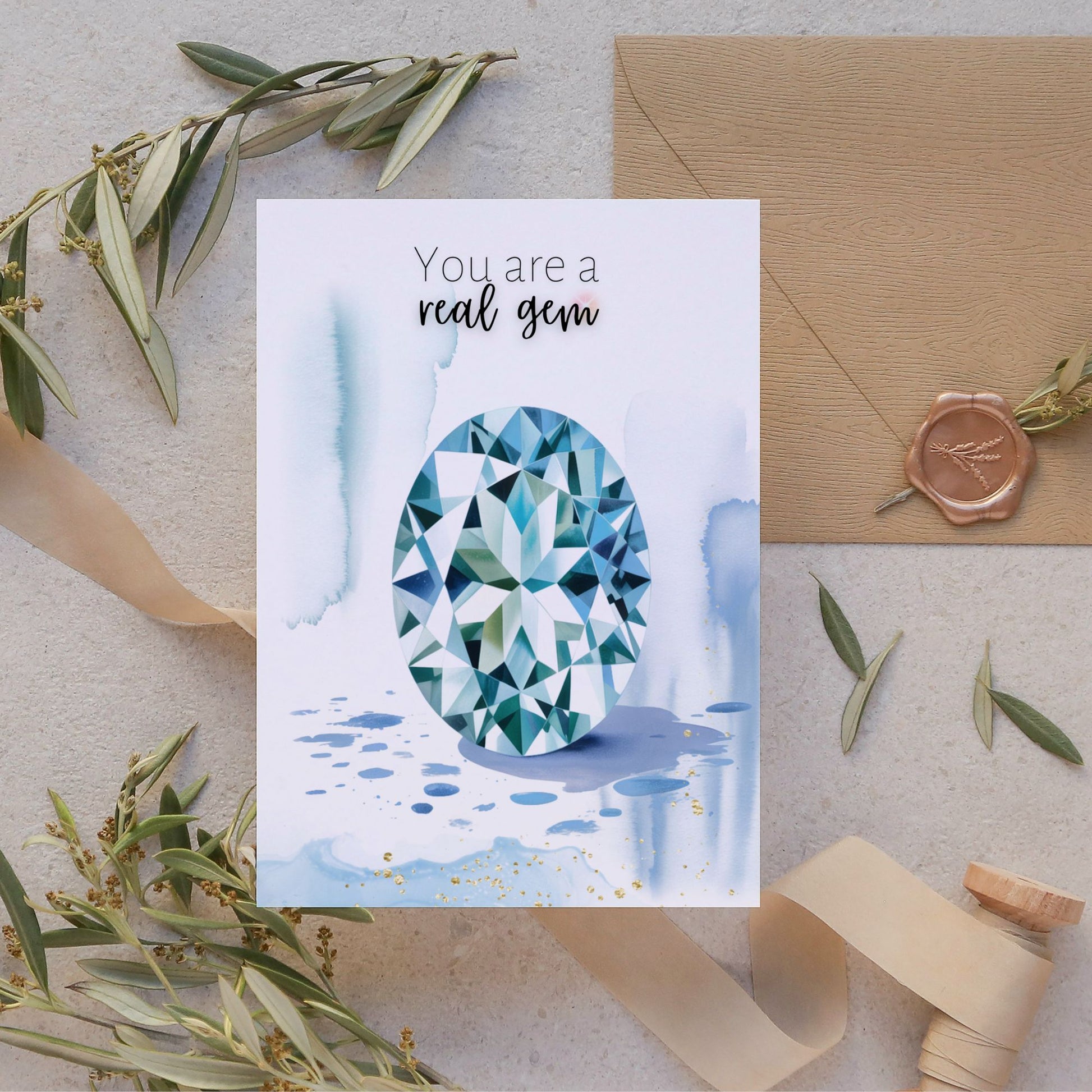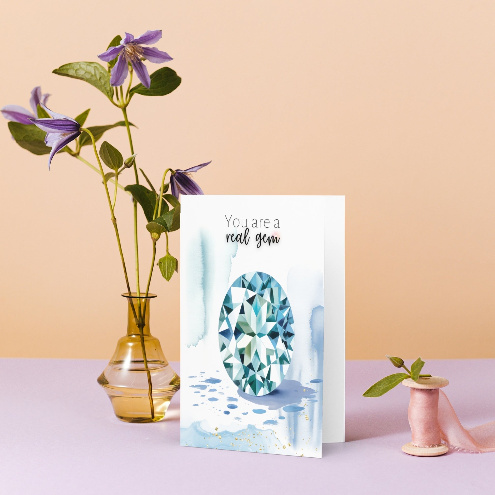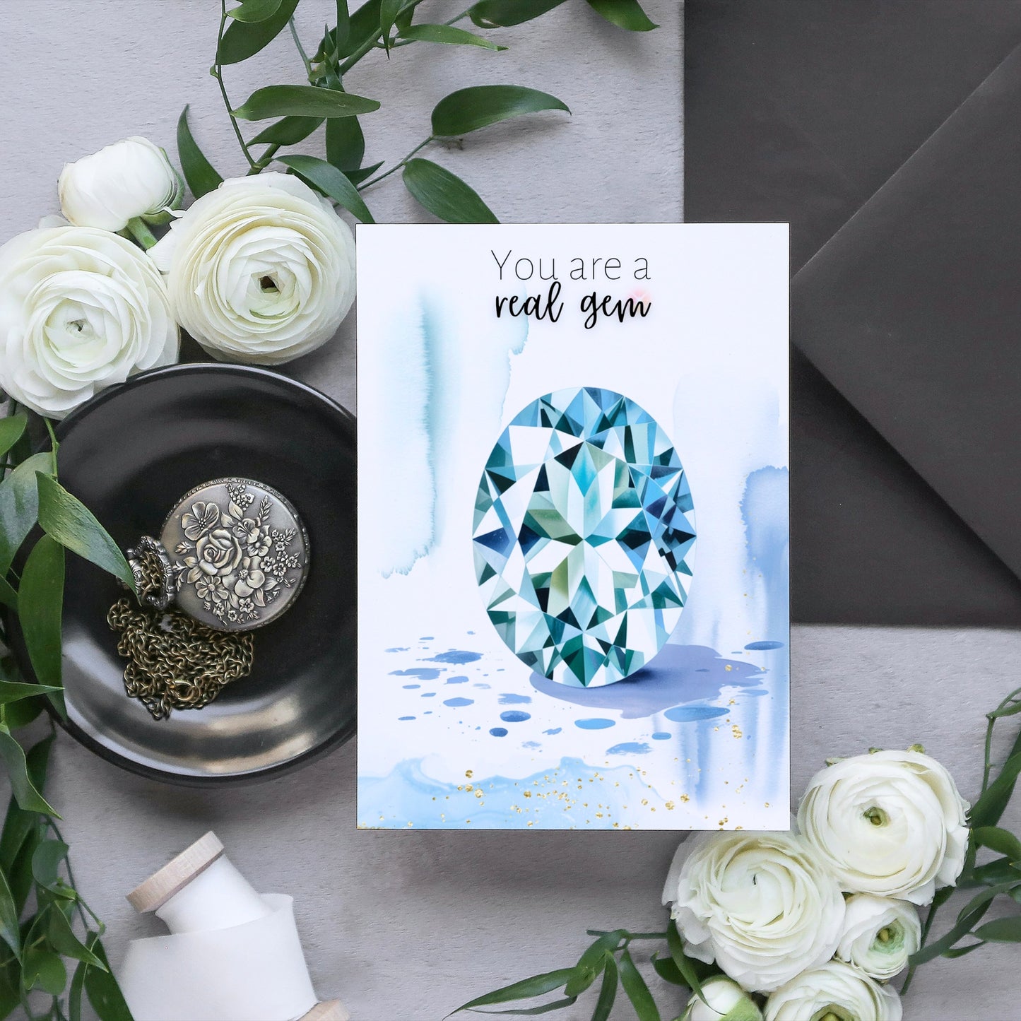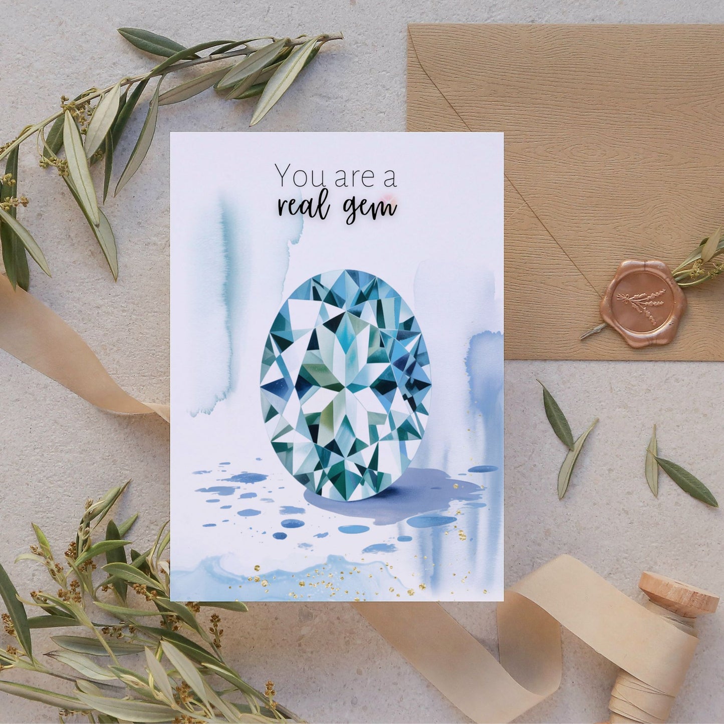 Celebrate your loved ones with our "You are a real gem" Watercolor Oval Aquamarine card! Perfect for March birthdays, Valentine's or Mother's Day, or just to say thanks to a precious gem in your life. With unique gemstone art and a playful tone, it's sure to make them feel extra special!