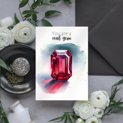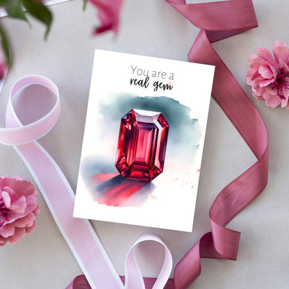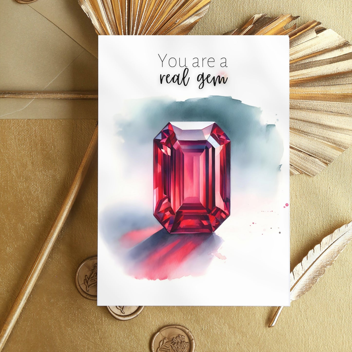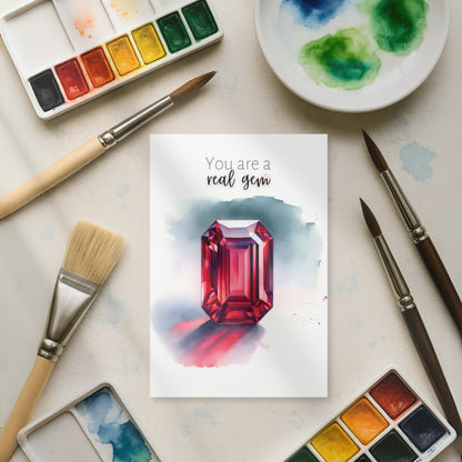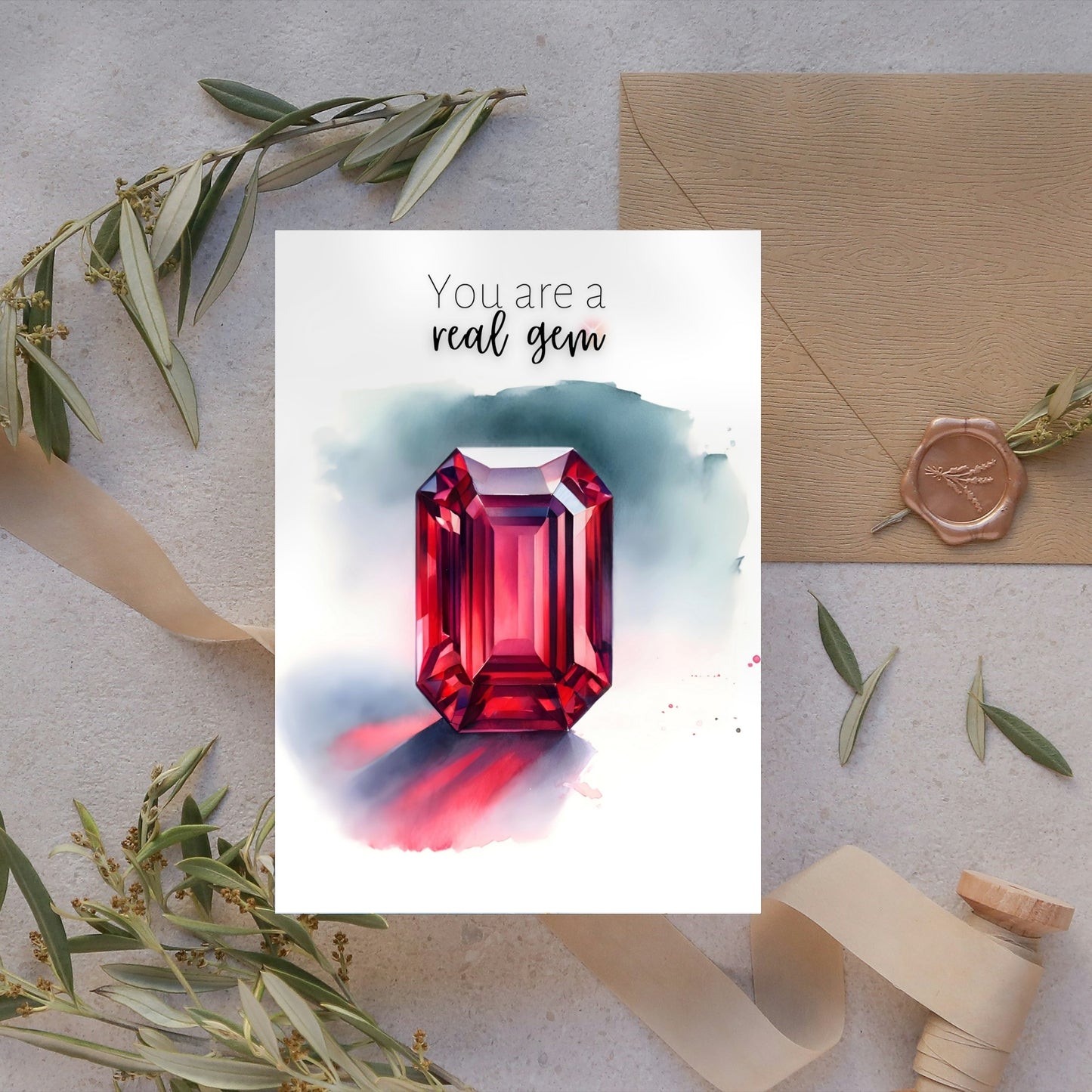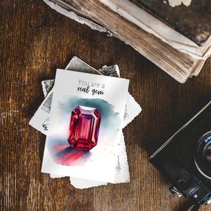 Trade in ordinary greeting cards for our "You are a real gem" emerald-shaped watercolor ruby card! Perfect for birthdays, Valentine's Day, Mother's Day, or just to show love to that special jewel in your life. With unique gem-inspired artwork and a heartfelt note, it's sure to make them feel extra treasured!