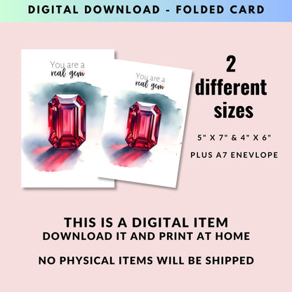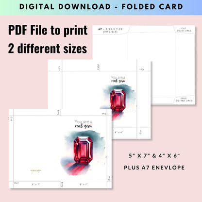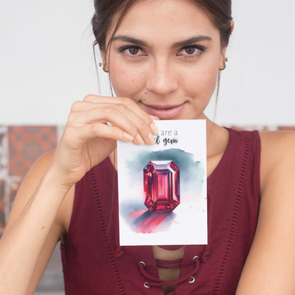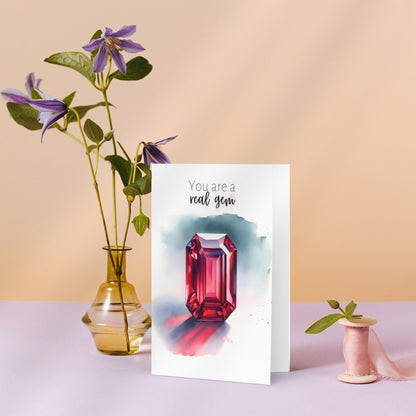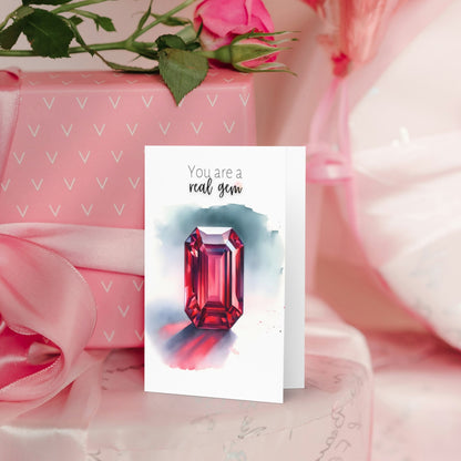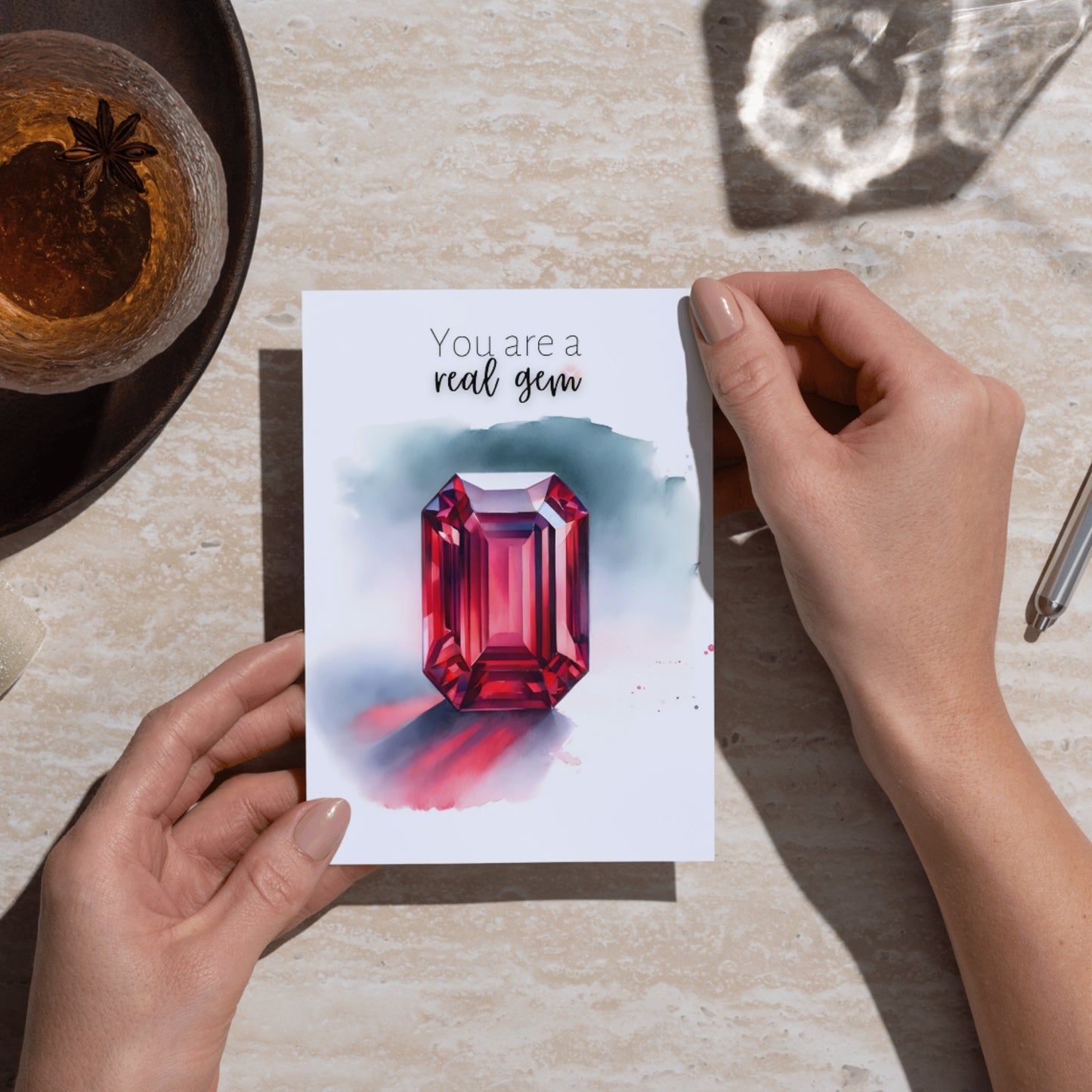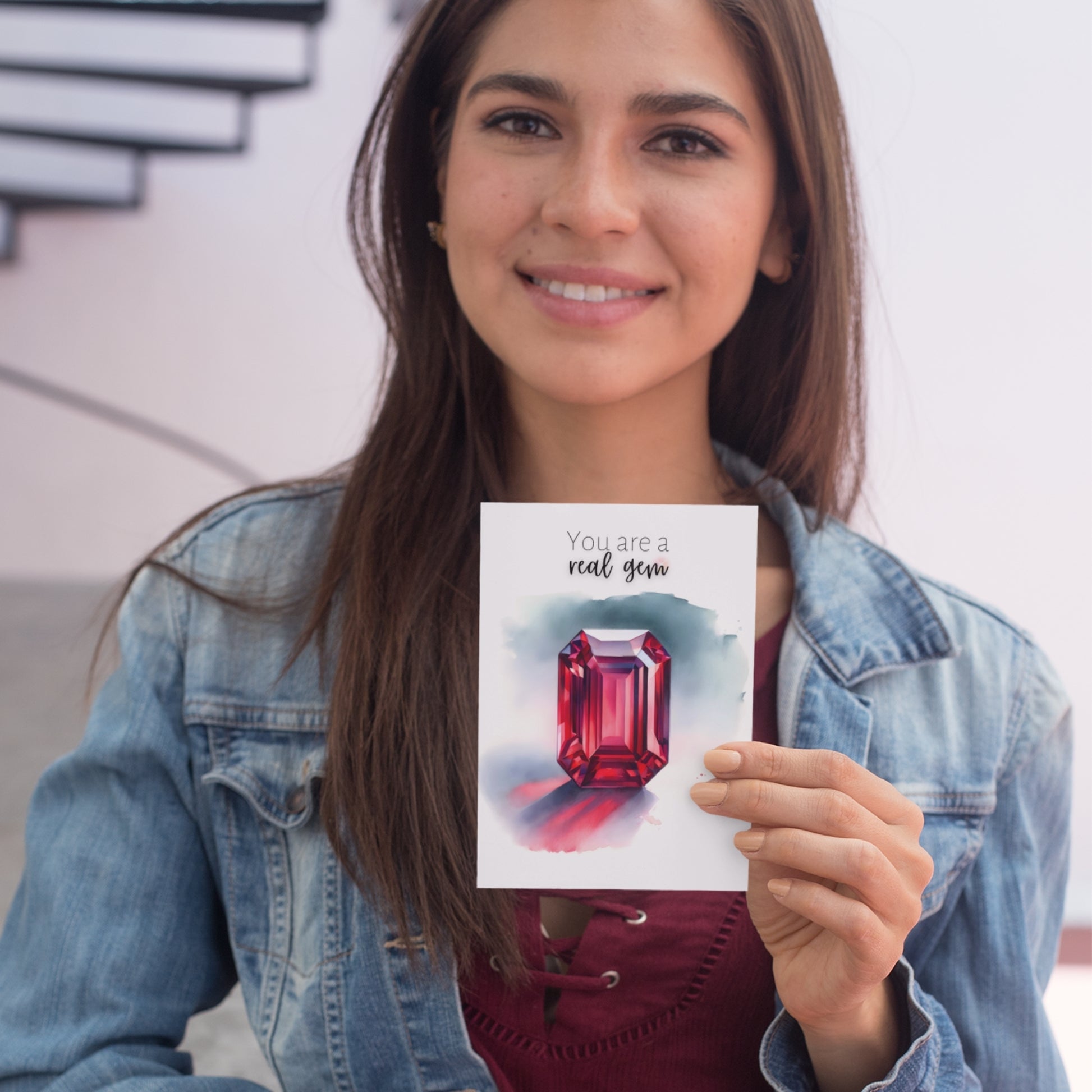 Trade in ordinary greeting cards for our "You are a real gem" emerald-shaped watercolor ruby card! Perfect for birthdays, Valentine's Day, Mother's Day, or just to show love to that special jewel in your life. With unique gem-inspired artwork and a heartfelt note, it's sure to make them feel extra treasured!