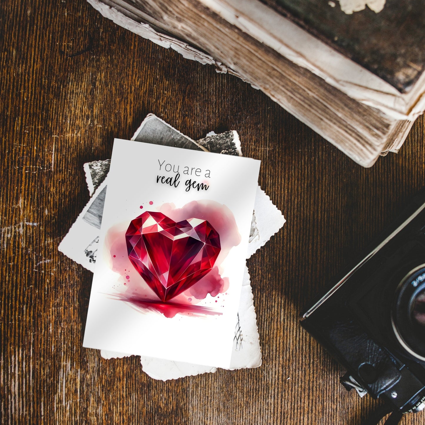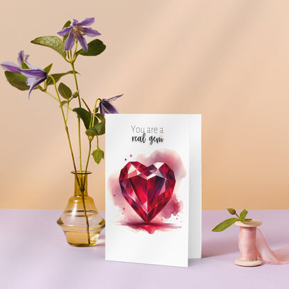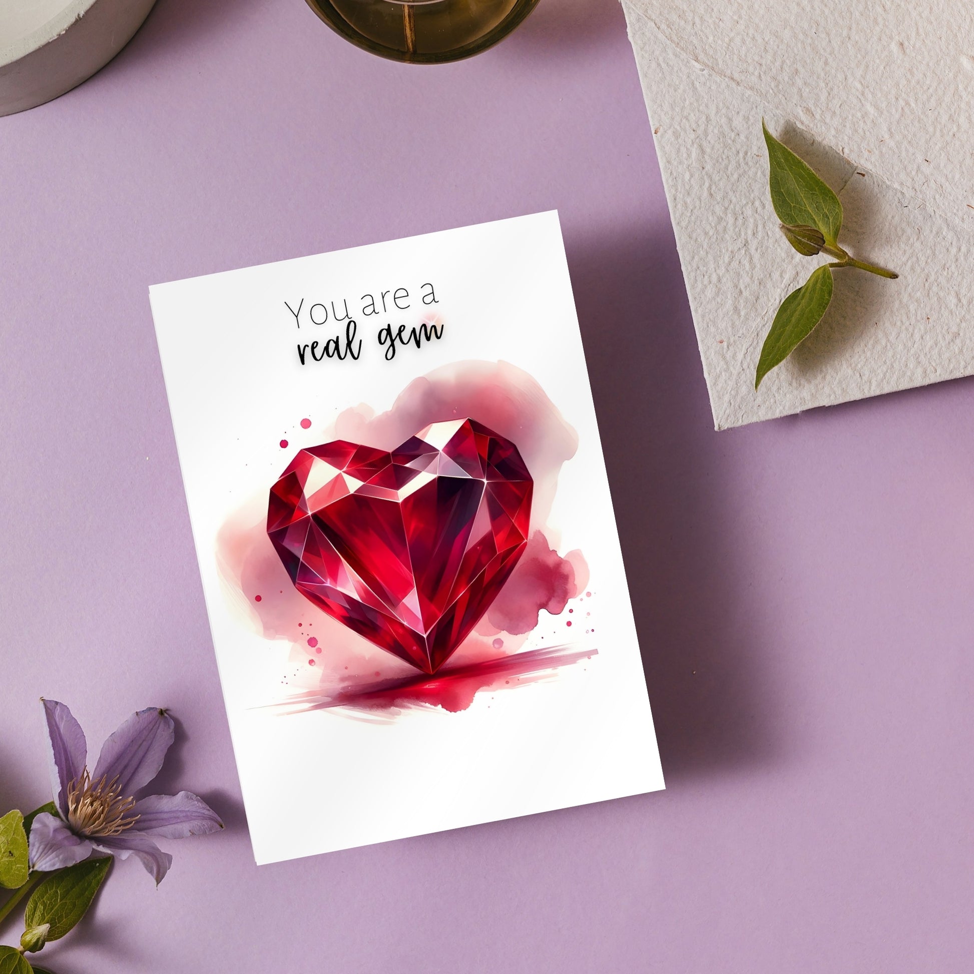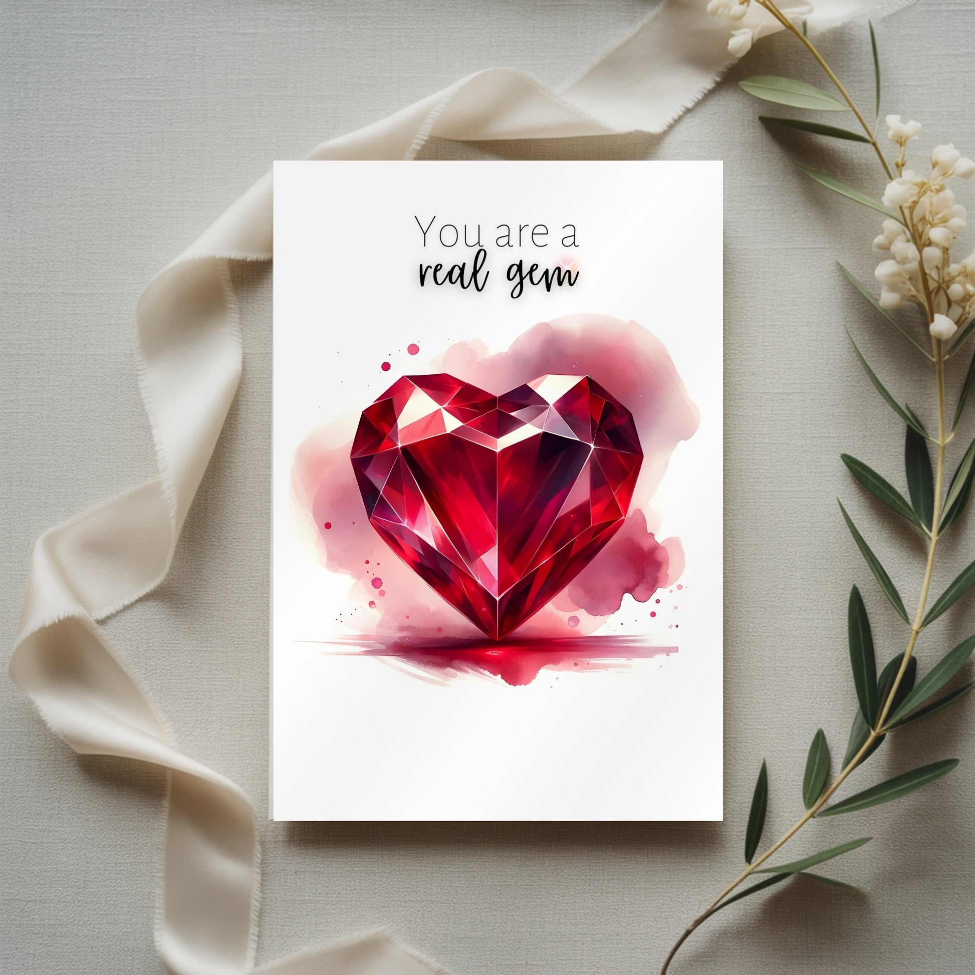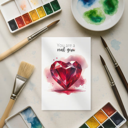 Celebrate your loved ones with our "You are a real gem" watercolor ruby heart card! Perfect for birthdays, Valentine's Day, Mother's Day, or just to say thanks to a precious gem in your life. With unique gemstone art and a heartful message tone, it's sure to make them feel extra special!