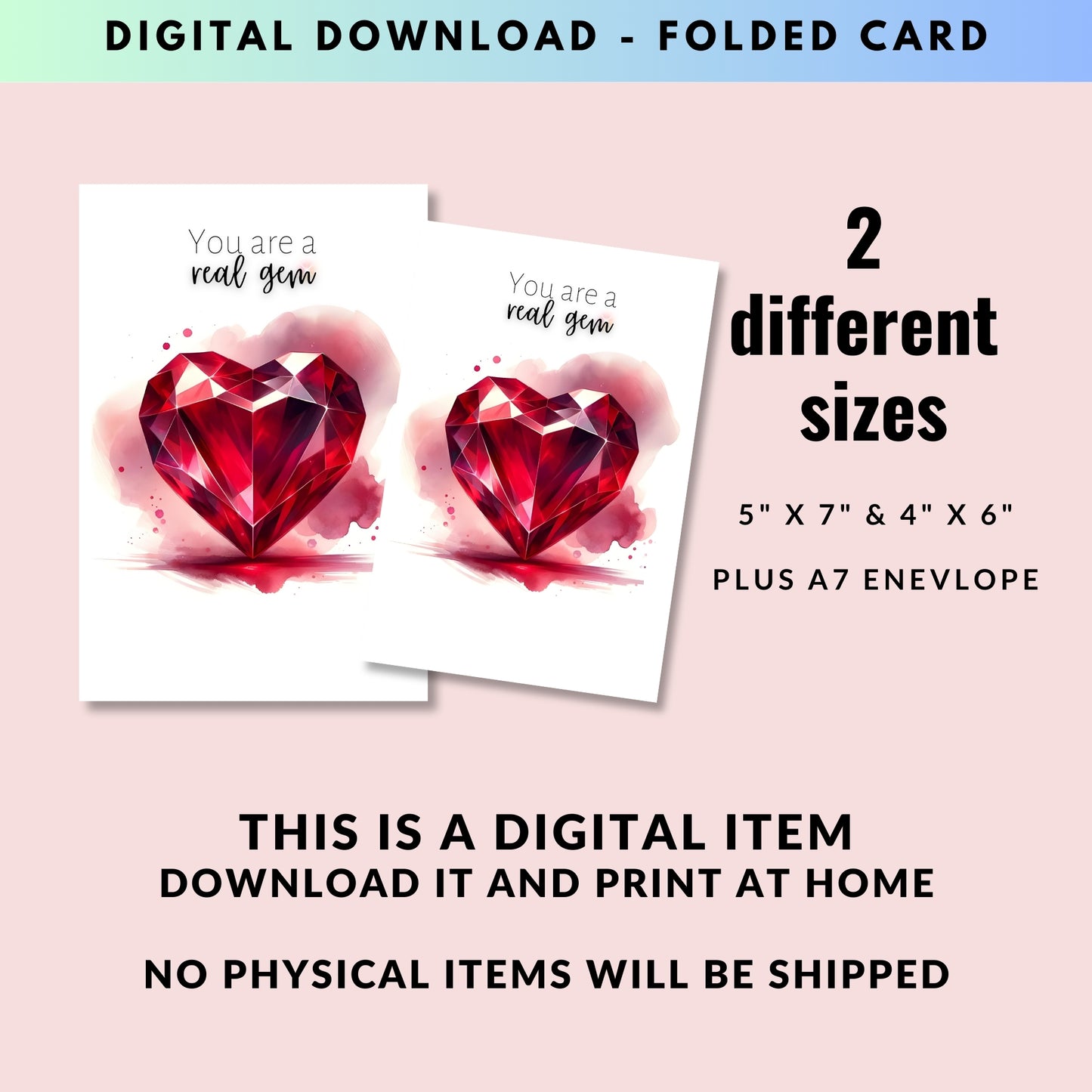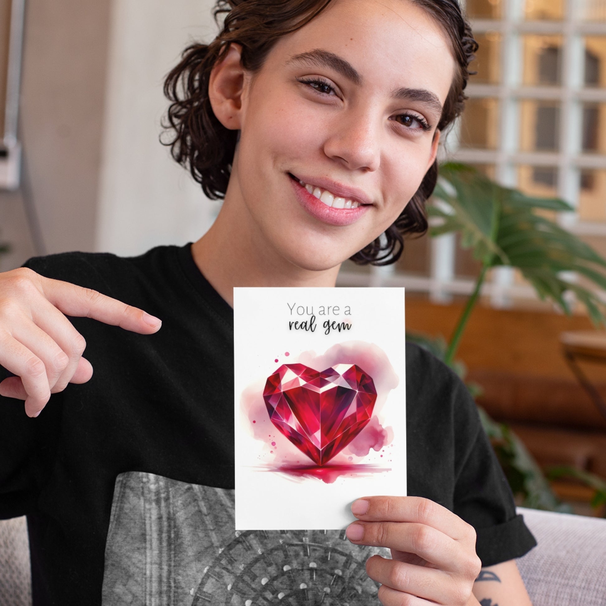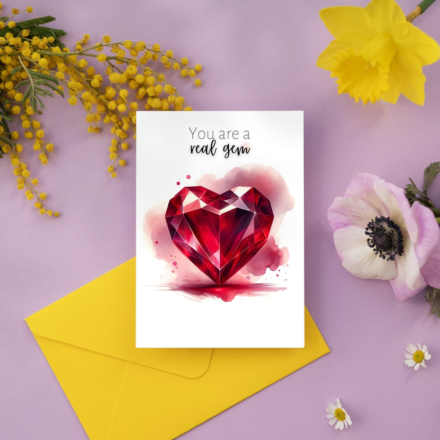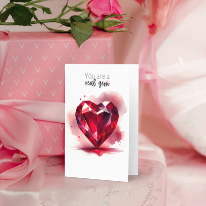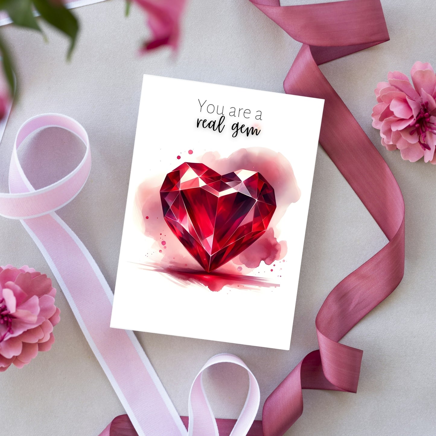 Celebrate your loved ones with our "You are a real gem" watercolor ruby heart card! Perfect for birthdays, Valentine's Day, Mother's Day, or just to say thanks to a precious gem in your life. With unique gemstone art and a heartful message tone, it's sure to make them feel extra special!
