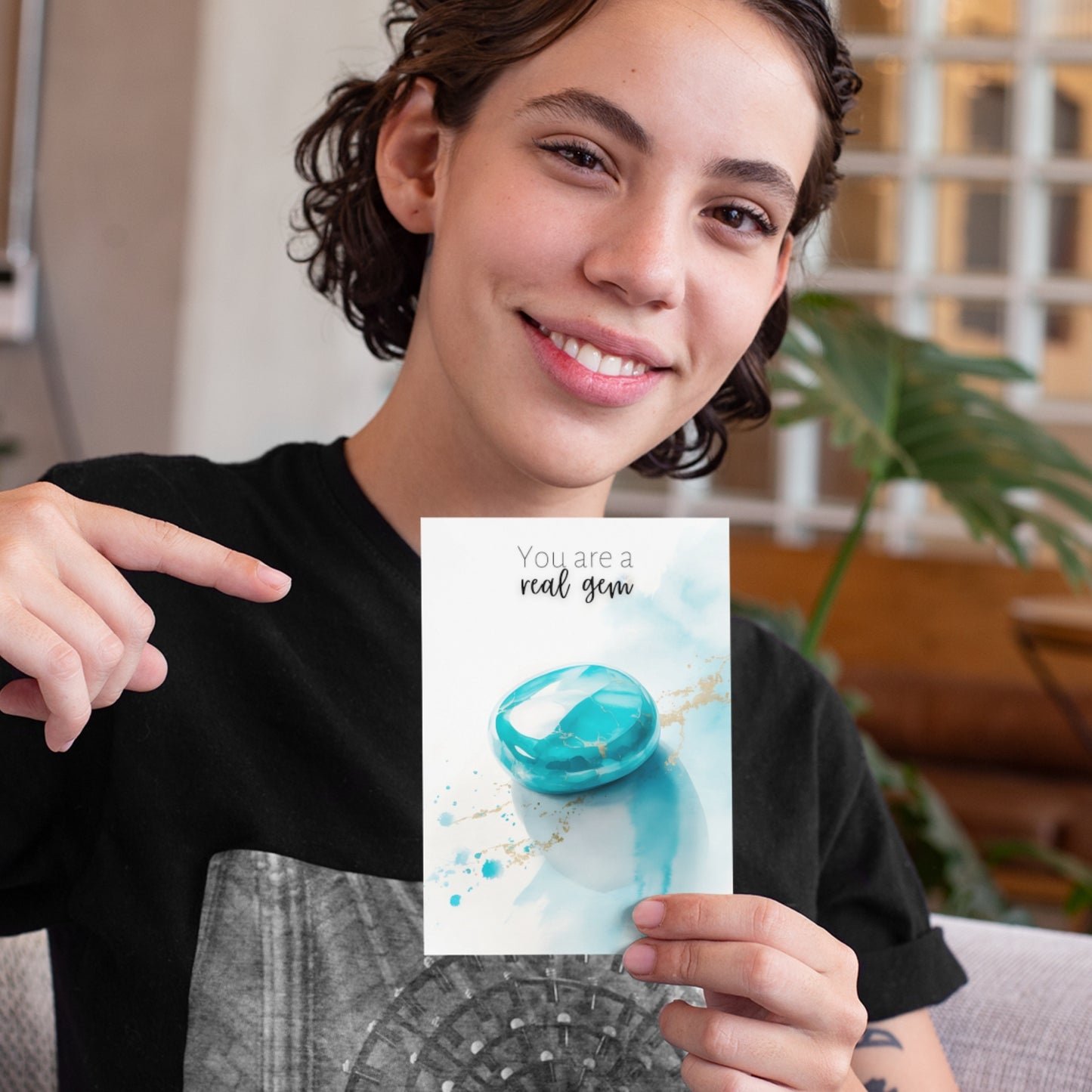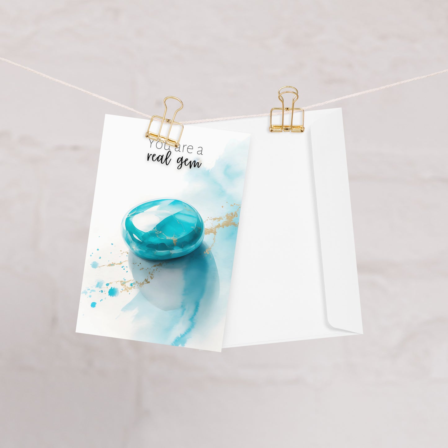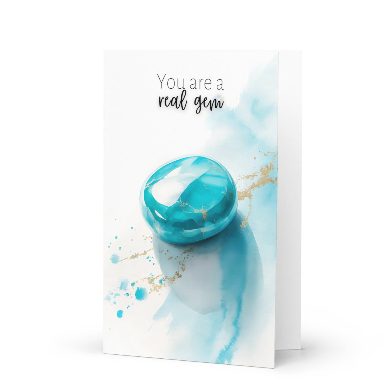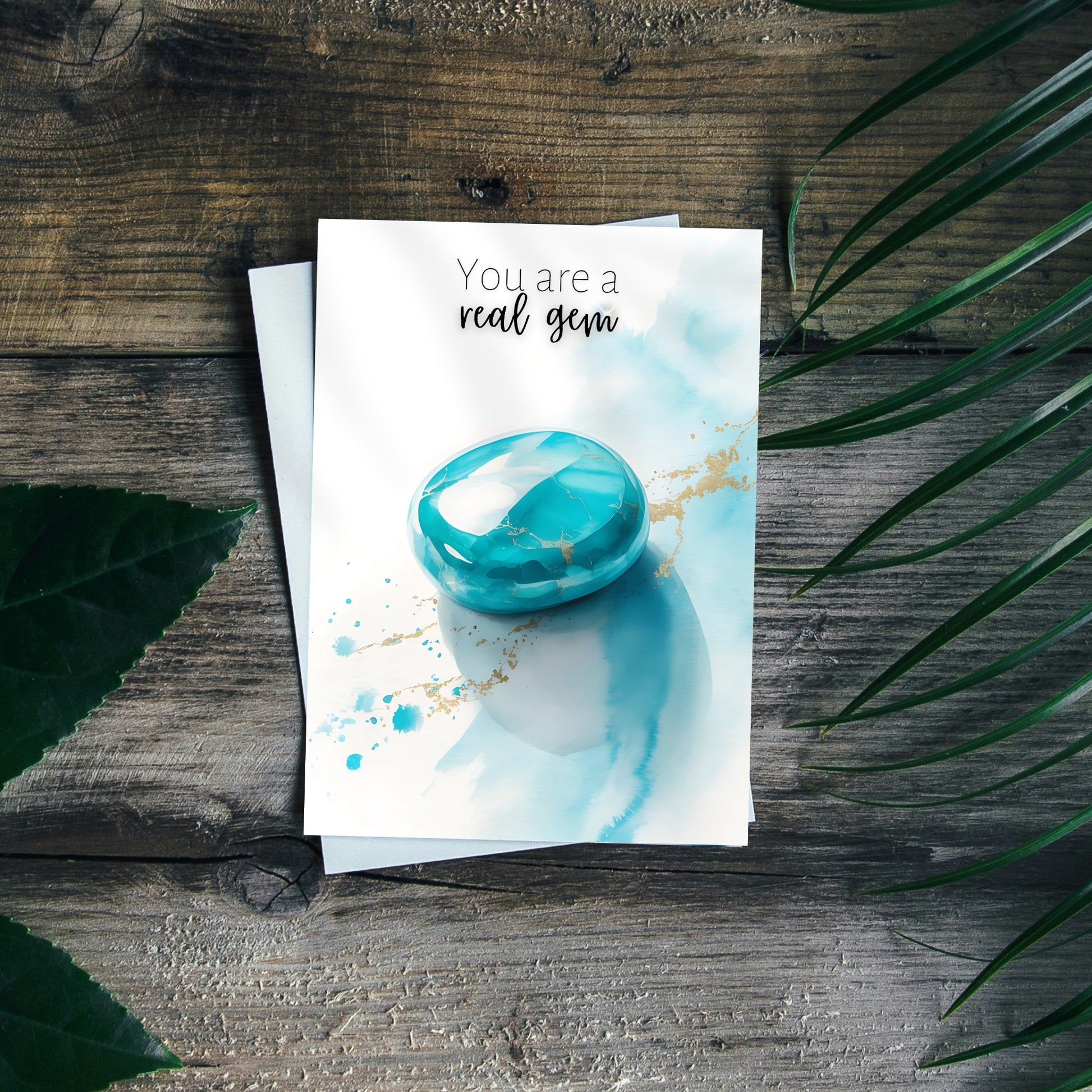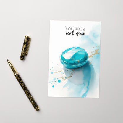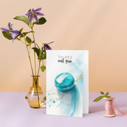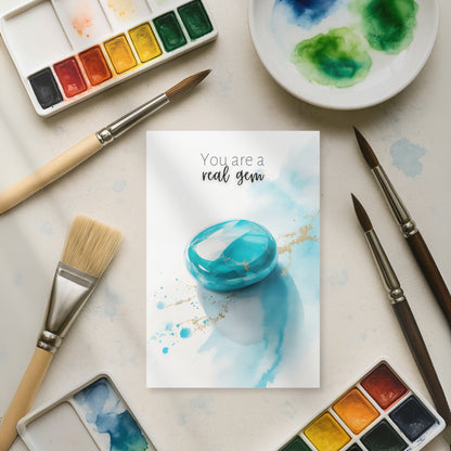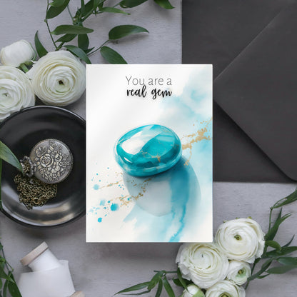 A card that pairs fine art and meaningful words, the "You Are a Real Gem" Watercolor Turquoise Greeting Card celebrates the qualities that make your recipient special. The watercolor turquoise design uses rich turquoise hues to capture the unique beauty of this well-loved rock, known for its calming tones and positive symbolism. Suitable for birthdays, anniversaries, thank-you notes, or any occasion when you want to remind someone of their worth.