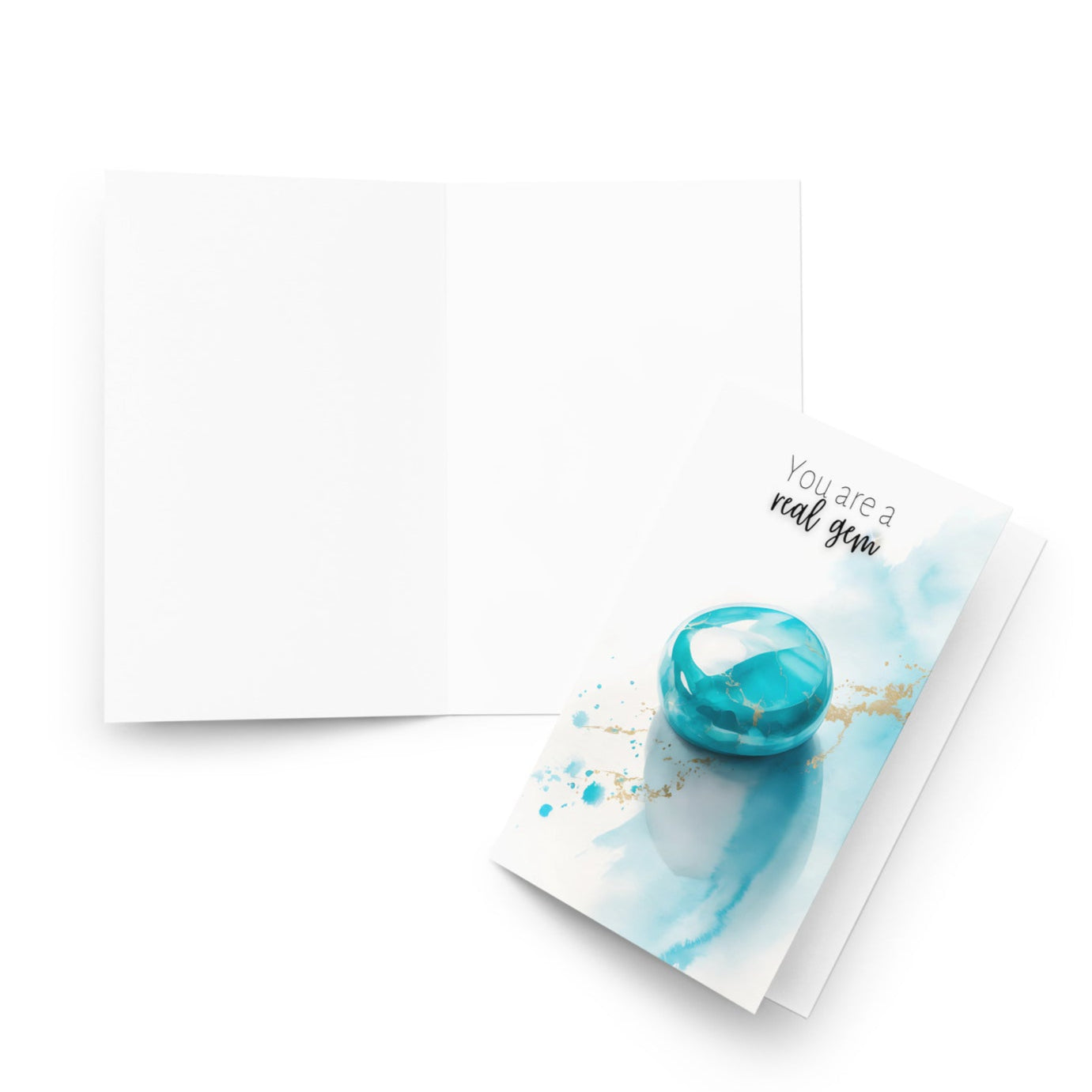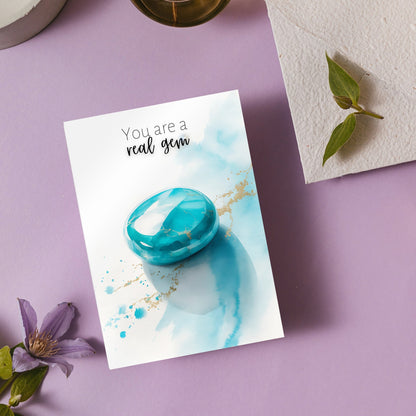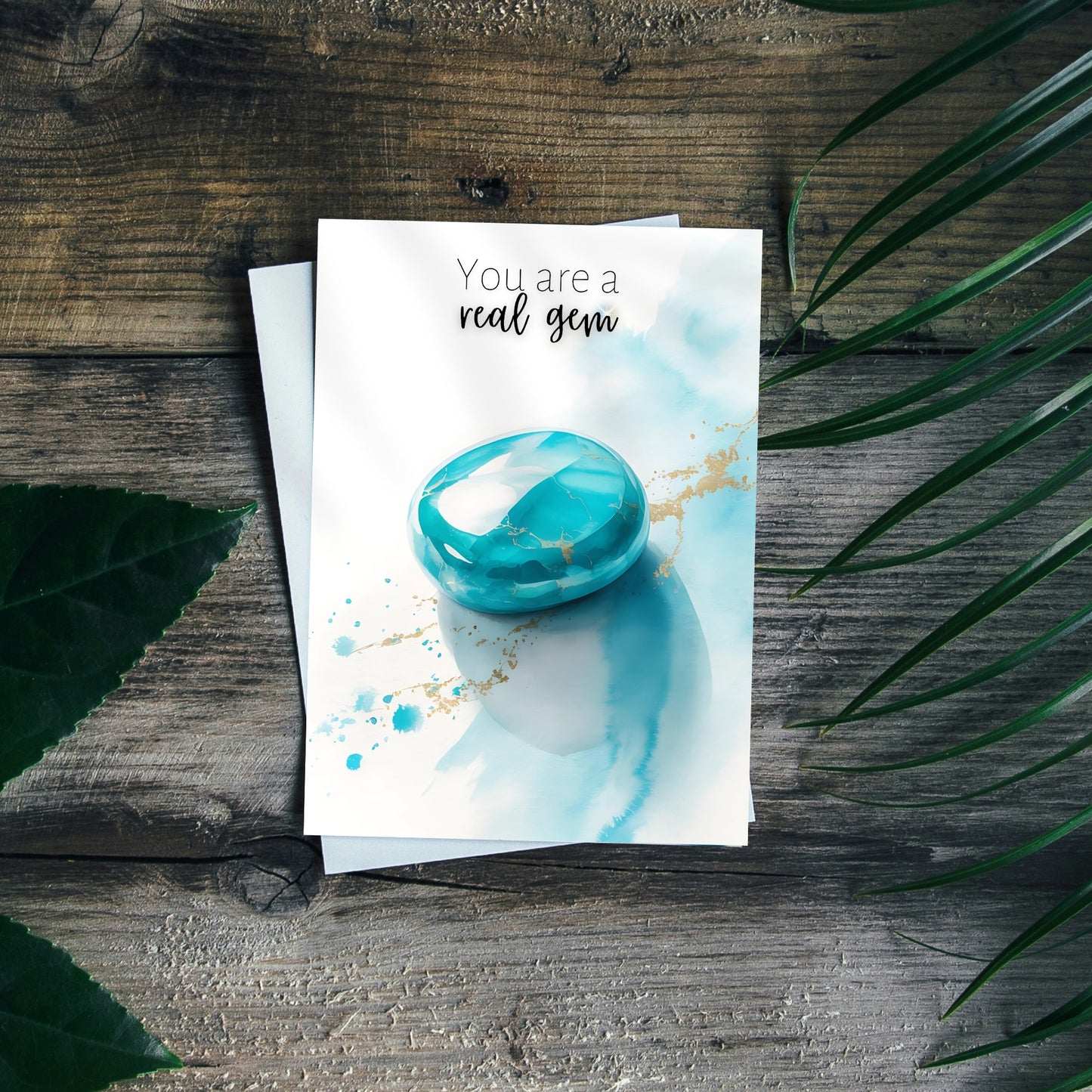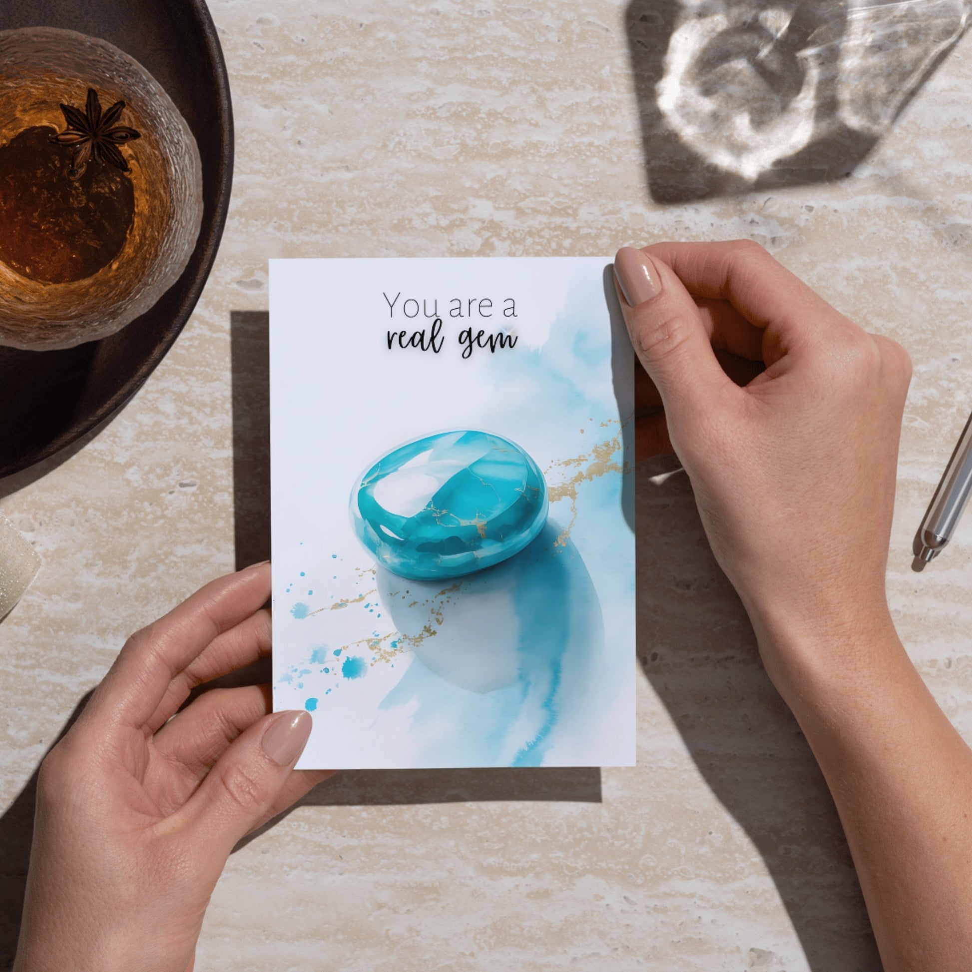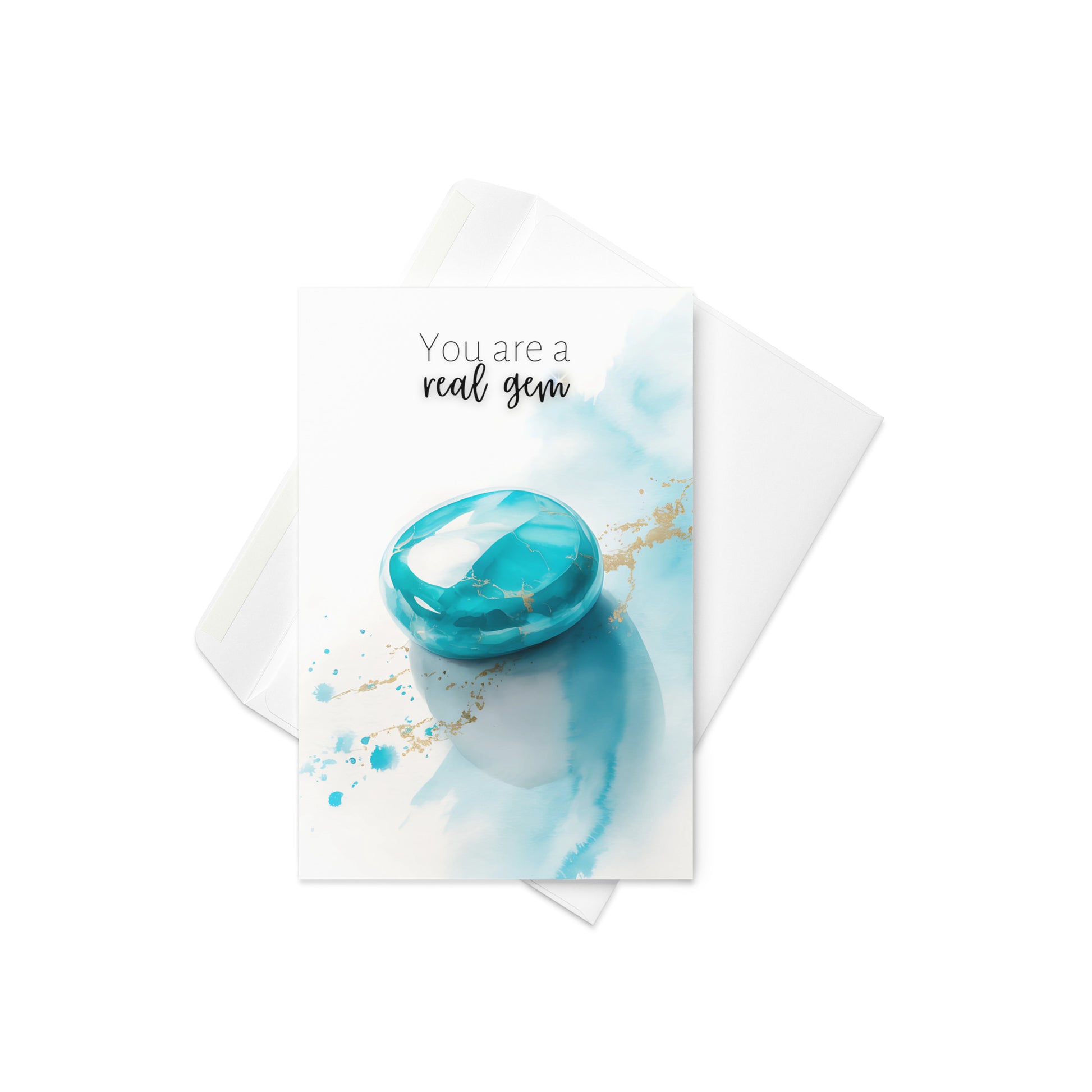 A card that pairs fine art and meaningful words, the "You Are a Real Gem" Watercolor Turquoise Greeting Card celebrates the qualities that make your recipient special. The watercolor turquoise design uses rich turquoise hues to capture the unique beauty of this well-loved rock, known for its calming tones and positive symbolism. Suitable for birthdays, anniversaries, thank-you notes, or any occasion when you want to remind someone of their worth.