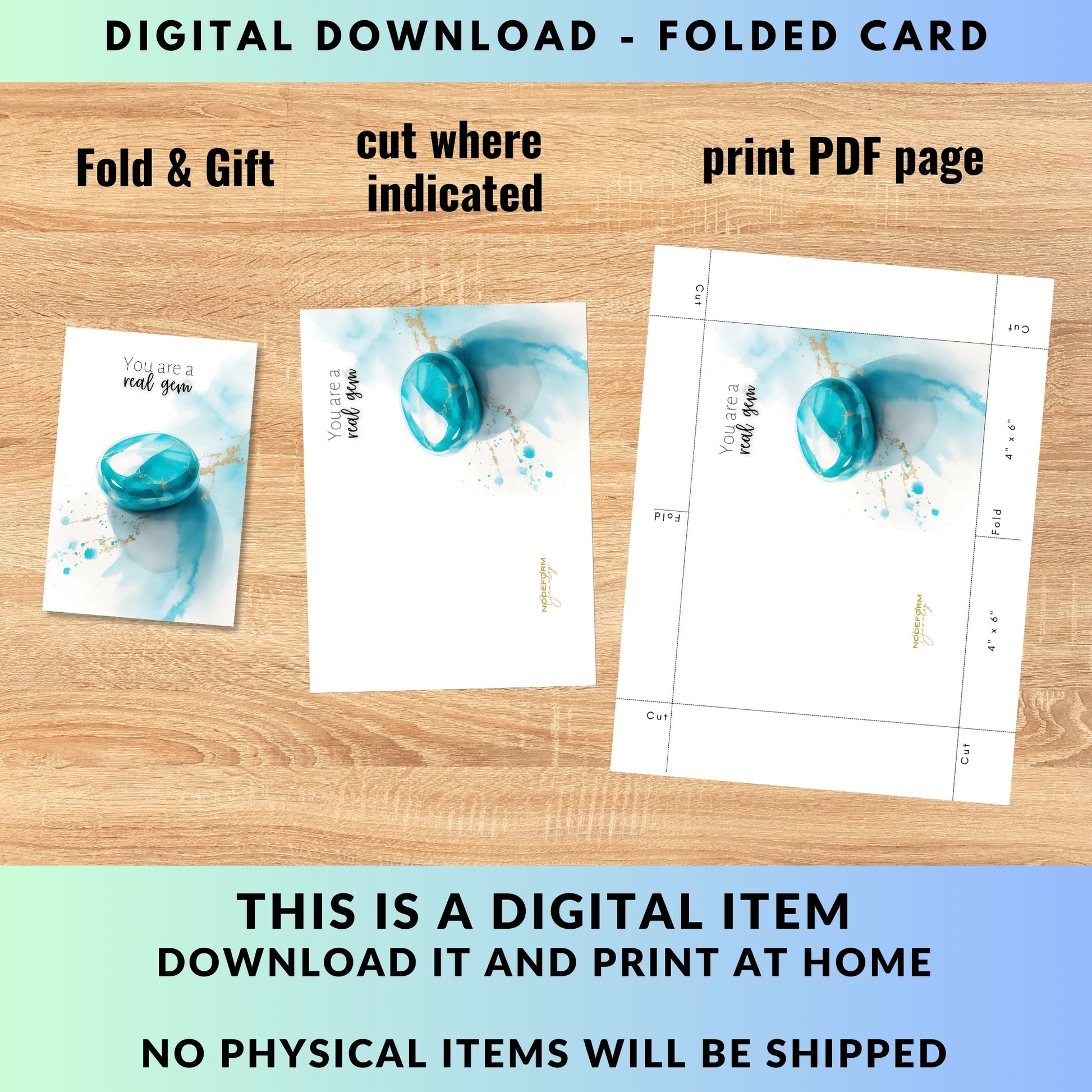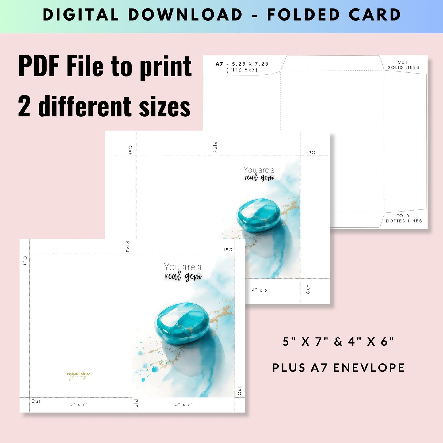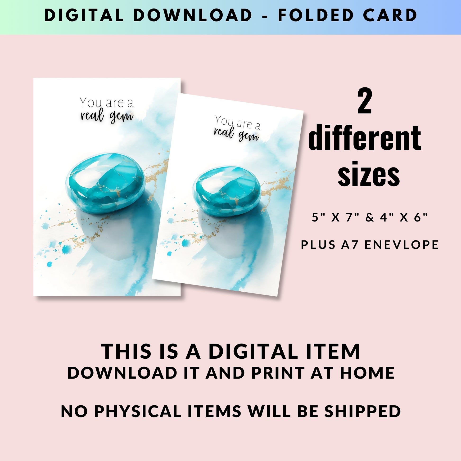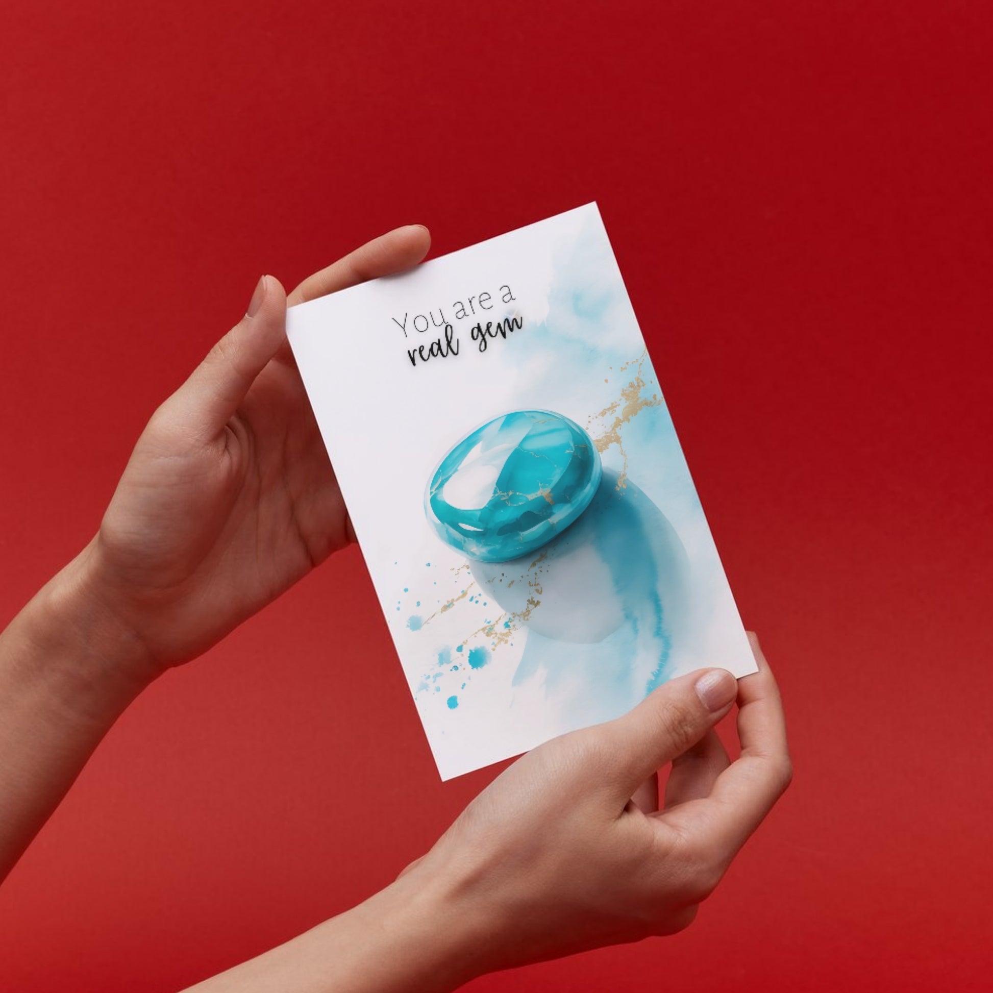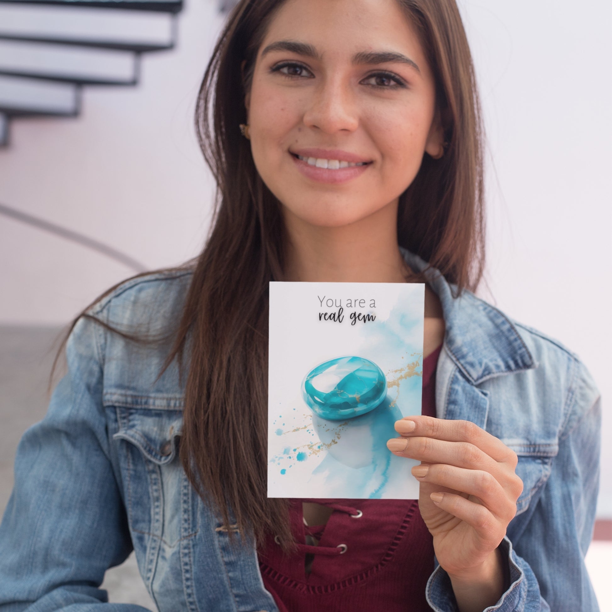 A card that pairs fine art and meaningful words, the "You Are a Real Gem" Watercolor Turquoise Greeting Card celebrates the qualities that make your recipient special. The watercolor turquoise design uses rich turquoise hues to capture the unique beauty of this well-loved rock, known for its calming tones and positive symbolism. Suitable for birthdays, anniversaries, thank-you notes, or any occasion when you want to remind someone of their worth.