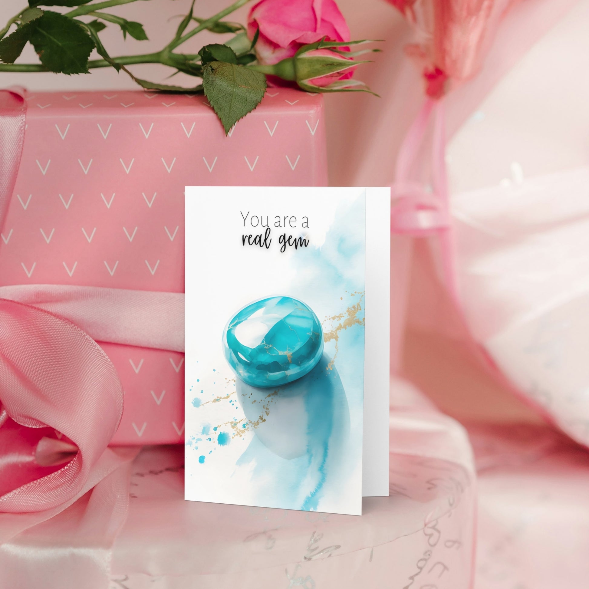 Turquoise, one of the many icy blue december birthstones, is valued for its protective and calming qualities. Giving a turquoise-themed card is a thoughtful gesture that carries a sense of wellbeing and appreciation. This makes it fitting not just as a thank-you, birthday or anniversary card, but any time you want to remind someone of how much they matter.